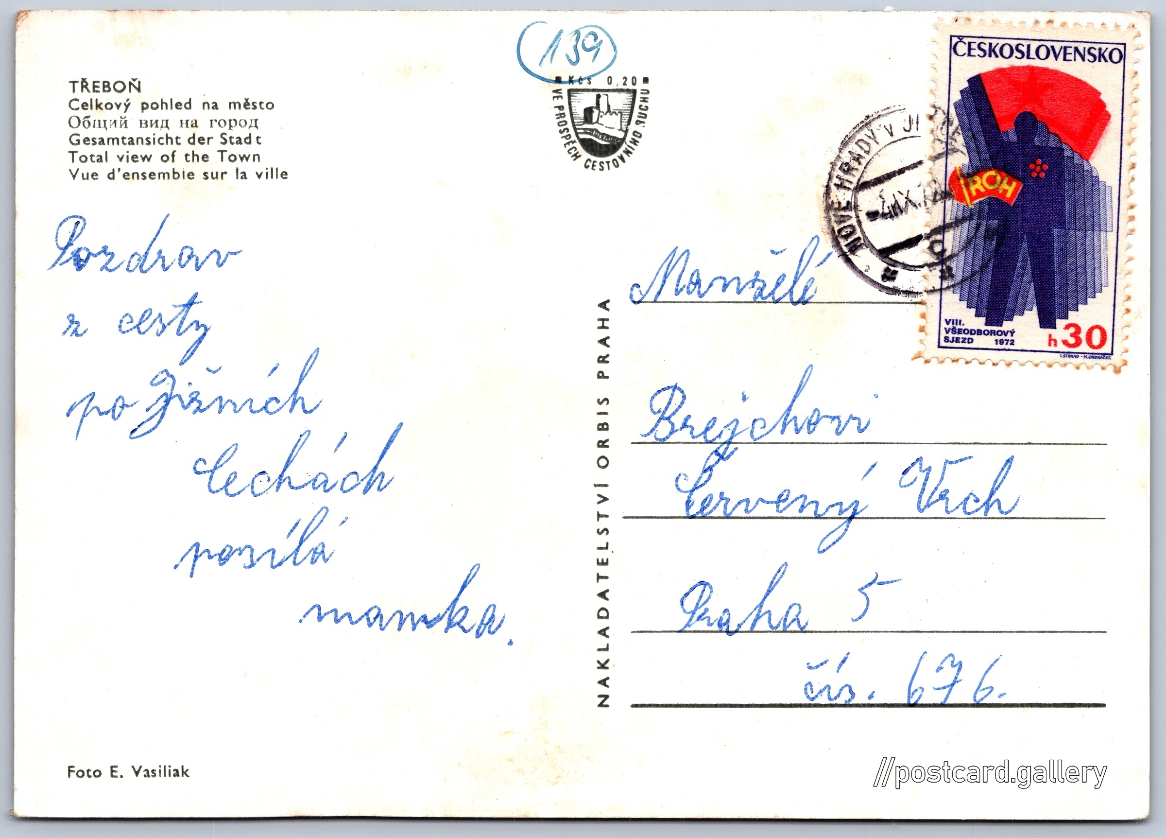 Třeboň, celkový pohled na město Pokud chcete vidět pohlednice ve vyšším rozlišení nebo zobrazovat jejich zadní stranu, tak se prosím nejdříve přihlašte Přihlásit Zaregistrovat TŘEBOŇ- Celkový pohled na město- Общий вид на город- Gesamtansicht der Stad t- Total view of the Town- Vue d'ensemble sur la ville Jazyky tištěného textu na pohlednici: čeština, ruština, němčina, angličtina, francouzština, francouzština Třeboň, Město, Česko ukázat na mapě Vydavatel: Nakladatelství Orbis (Československo) Odhadované datum vydání pohlednice: 1969 - 1972 Pomozte nám zpřesnit rok vzniku pohlednice Velikost (š x v) a tvar pohlednice: 148 x 105 mm (5.83" x 4.13"), obdélník Osoby spjaté s touto pohlednicí: Eugen Vasiliak(Autor fotografie) Prošlá poštou:Datum na razítku: 4.9.1972 Ceny: Příplatek na tur. ruch: 0,20 Kčs (CSK))Vyplacené známky: 0,30 Kčs (CSK) DiskuseVložit příspěvek Přidat novou složku ... Spravovat složky ...