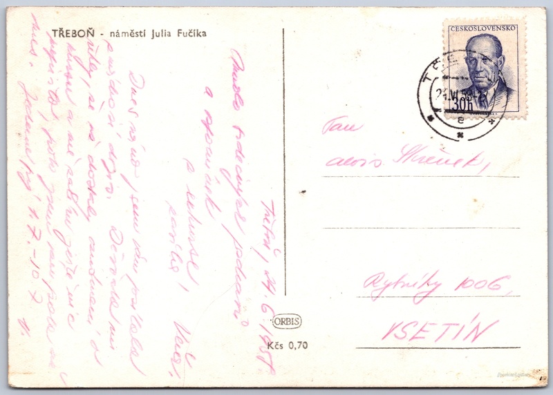 Třeboň, náměstí Julia Fučíka Pokud chcete vidět pohlednice ve vyšším rozlišení nebo zobrazovat jejich zadní stranu, tak se prosím nejdříve přihlašte Přihlásit Zaregistrovat TŘEBOŇ - náměstí Julia Fučíka Jazyk tištěného textu na pohlednici: čeština Masarykovo nám., Třeboň, Jindřichův Hradec ukázat na mapě V blízkém okolí místa zobrazeného na pohlednici lze najít 7 jiných pohlednic. Zobrazit blízké pohlednice Vydavatel: Nakladatelství Orbis (Československo) Odhadované datum vydání pohlednice: 1955 - 1958 Pomozte nám zpřesnit rok vzniku pohlednice Velikost (š x v) a tvar pohlednice: 146 x 103 mm (5.75" x 4.06"), obdélník Osoby spjaté s touto pohlednicí: Julius Fučík(Obsah pohlednice) Prošlá poštou:Datum na razítku: 24.6.1958Datum napsání pohledu: 24.6.1958 Ceny: Cena pohlednice: 0,70 Kčs (CSK)Vyplacené známky: 0,30 Kčs (CSK) DiskuseVložit příspěvek Přidat novou složku ... Spravovat složky ...