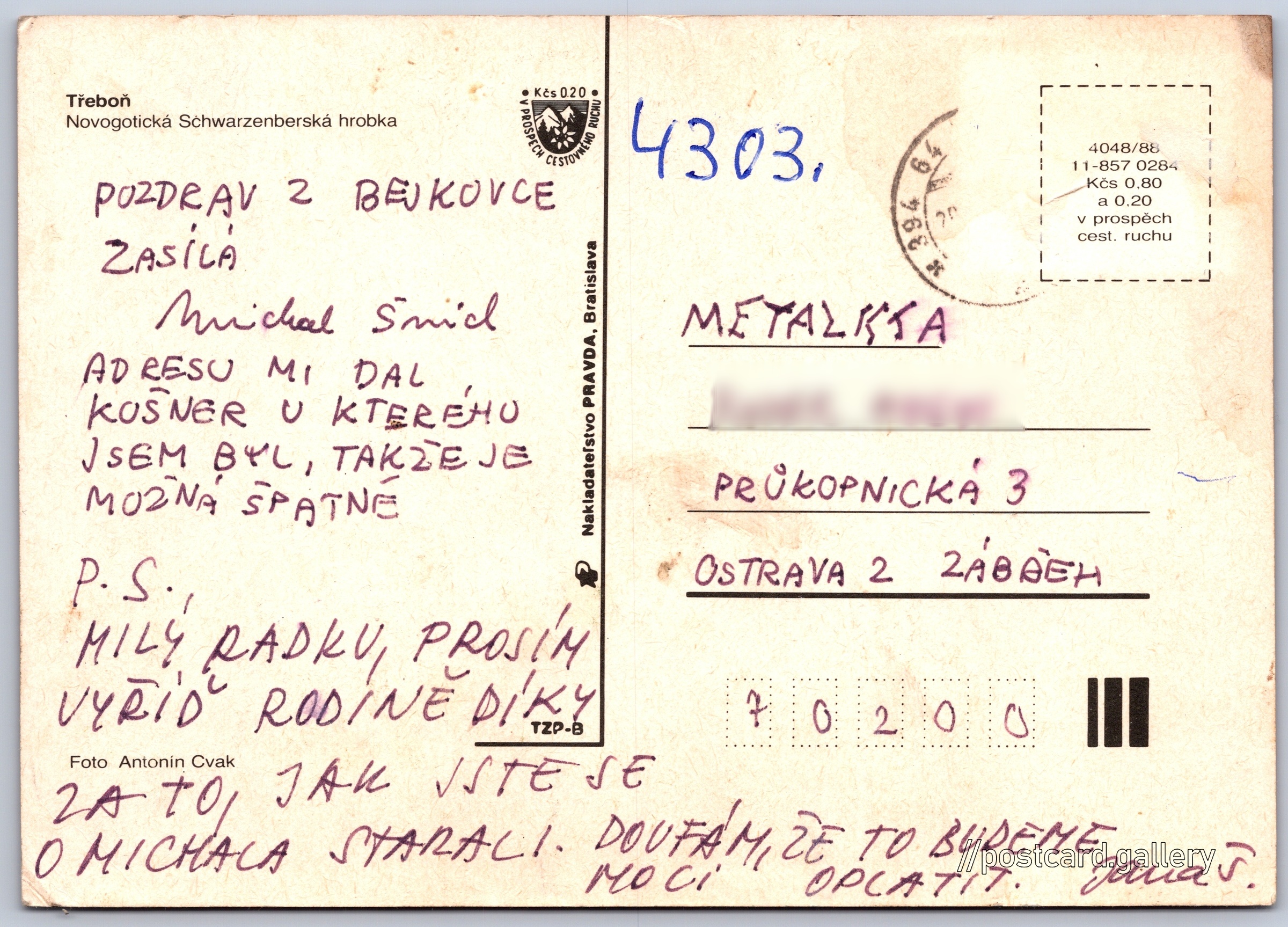 Cena pohlednice: 0,80 Kčs (CSK) (+0,20 Kčs přípl. na tur. ruch)