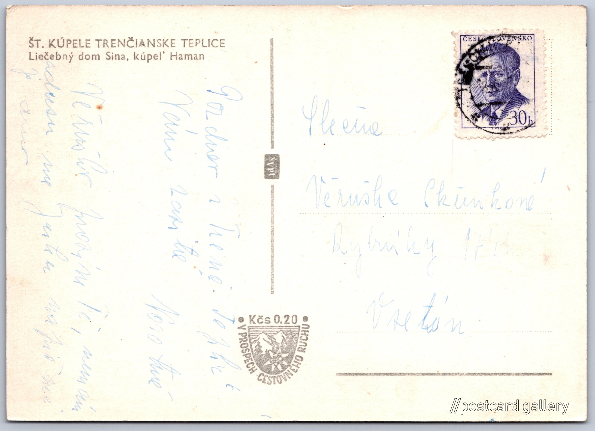 Trenčianske Teplice, Liečebný dom Sina Pokud chcete vidět pohlednice ve vyšším rozlišení nebo zobrazovat jejich zadní stranu, tak se prosím nejdříve přihlašte Přihlásit Zaregistrovat ŠT. KÚPELE TRENČIANSKE TEPLICELiečebný dom Sina, kúpeľ' Haman Jazyk tištěného textu na pohlednici: slovenština Hammam, Historická budova, 17. novembra 319/37, Trenčianske Teplice, Slovensko ukázat na mapě V blízkém okolí místa zobrazeného na pohlednici lze najít 13 jiných pohlednic. Zobrazit blízké pohlednice Vydavatel: VPL (Československo) Odhadované datum vydání pohlednice: 1957 - 1960 Pomozte nám zpřesnit rok vzniku pohlednice Velikost (š x v) a tvar pohlednice: 146 x 104 mm (5.75" x 4.09"), obdélník Prošlá poštou Ceny: Příplatek na tur. ruch: 0,20 Kčs (CSK))Vyplacené známky: 0,30 Kčs (CSK) DiskuseVložit příspěvek Přidat novou složku ... Spravovat složky ...