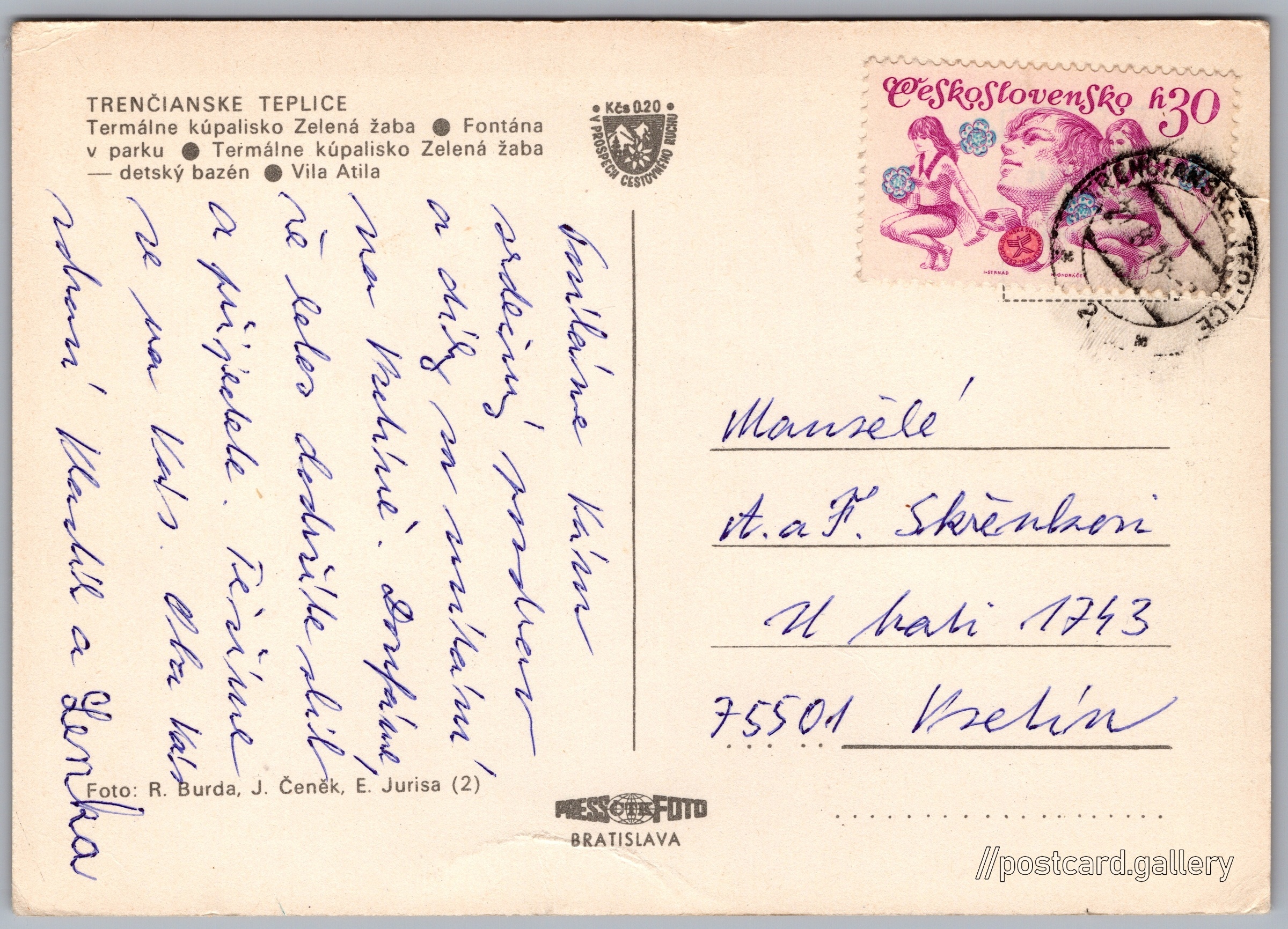 Trenčianske Teplice, Zelená žaba 4/13 Pokud chcete vidět pohlednice ve vyšším rozlišení nebo zobrazovat jejich zadní stranu, tak se prosím nejdříve přihlašte Přihlásit Zaregistrovat Zelená žaba TRENČIANSKE TEPLICE- Termálne kúpalisko Zelená žaba- Fontána v parku- Termálne kúpalisko Zelená žaba - detský bazén- Vila Atila Jazyk tištěného textu na pohlednici: slovenština Trenčianske Teplice, Město, Slovensko ukázat na mapě V blízkém okolí místa zobrazeného na pohlednici lze najít 13 jiných pohlednic. Zobrazit blízké pohlednice Vydavatel: PressFoto Bratislava (Československo) Odhadované datum vydání pohlednice: 1972 - 1975 Pomozte nám zpřesnit rok vzniku pohlednice Velikost (š x v) a tvar pohlednice: 149 x 106 mm (5.87" x 4.17"), obdélník Osoby spjaté s touto pohlednicí: Jaroslav Čeněk(Autor fotografie) R. Burda(Autor fotografie) E. Jurisa(Autor fotografie) Prošlá poštou:Datum na razítku: 27.8.1975 Ceny: Příplatek na tur. ruch: 0,20 Kčs (CSK))Vyplacené známky: 0,30 Kčs (CSK) DiskuseVložit příspěvek Přidat novou složku ... Spravovat složky ...