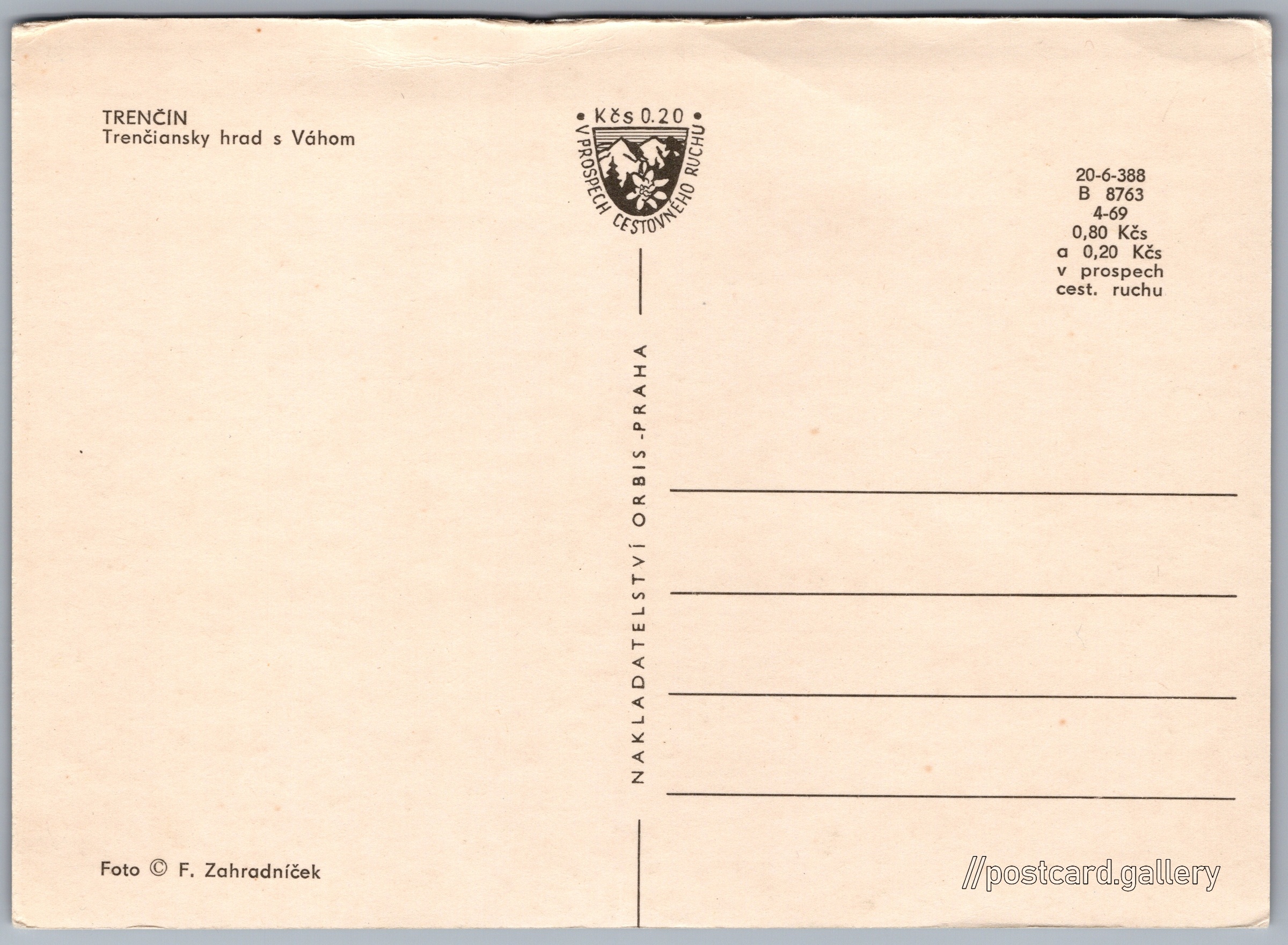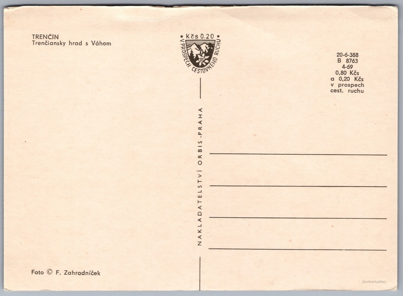 Trenčínský hrad 6/9 Pokud chcete vidět pohlednice ve vyšším rozlišení nebo zobrazovat jejich zadní stranu, tak se prosím nejdříve přihlašte Přihlásit Zaregistrovat TRENČINTrenčiansky hrad s Váhom Jazyk tištěného textu na pohlednici: čeština Trenčínský hrad, Hrad, Trenčín, Slovensko ukázat na mapě V blízkém okolí místa zobrazeného na pohlednici lze najít 9 jiných pohlednic. Zobrazit blízké pohlednice Vydavatel: Nakladatelství Orbis (Československo) Datum vydání není známo Pomozte nám odhadnout datum vzniku pohlednice Velikost (š x v) a tvar pohlednice: 148 x 107 mm (5.83" x 4.21"), obdélník Osoby spjaté s touto pohlednicí: František Zahradníček(Autor fotografie) Čistá pohlednice (neprošlá poštou) Ceny: Cena pohlednice: 0,80 Kčs (CSK) (+0,20 Kčs přípl. na tur. ruch) Kódy na pohlednici: 20-6-388 B 8763 4-69 DiskuseVložit příspěvek Přidat novou složku ... Spravovat složky ...