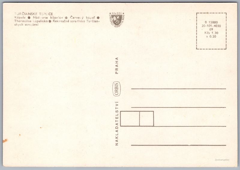Turčianske Teplice Pokud chcete vidět pohlednice ve vyšším rozlišení nebo zobrazovat jejich zadní stranu, tak se prosím nejdříve přihlašte Přihlásit Zaregistrovat Turčianske Teplice TURČIANSKE TEPLICE- Kúpele- Nádvorie kúpeľov- Červený kupeľ- Thermálne kúpalisko- Rekreačné stredisko Turčianskych strojární Jazyk tištěného textu na pohlednici: slovenština Turčianske Teplice, Město, Slovensko ukázat na mapě V blízkém okolí místa zobrazeného na pohlednici lze najít 7 jiných pohlednic. Zobrazit blízké pohlednice Vydavatel: Nakladatelství Orbis (Československo) Datum vydání není známo Pomozte nám odhadnout datum vzniku pohlednice Velikost (š x v) a tvar pohlednice: 148 x 104 mm (5.83" x 4.09"), obdélník Čistá pohlednice (neprošlá poštou) Ceny: Cena pohlednice: 1,30 Kčs (CSK) (+0,20 Kčs přípl. na tur. ruch) Kódy na pohlednici: B 15880 20-101-4030 09 DiskuseVložit příspěvek Přidat novou složku ... Spravovat složky ...