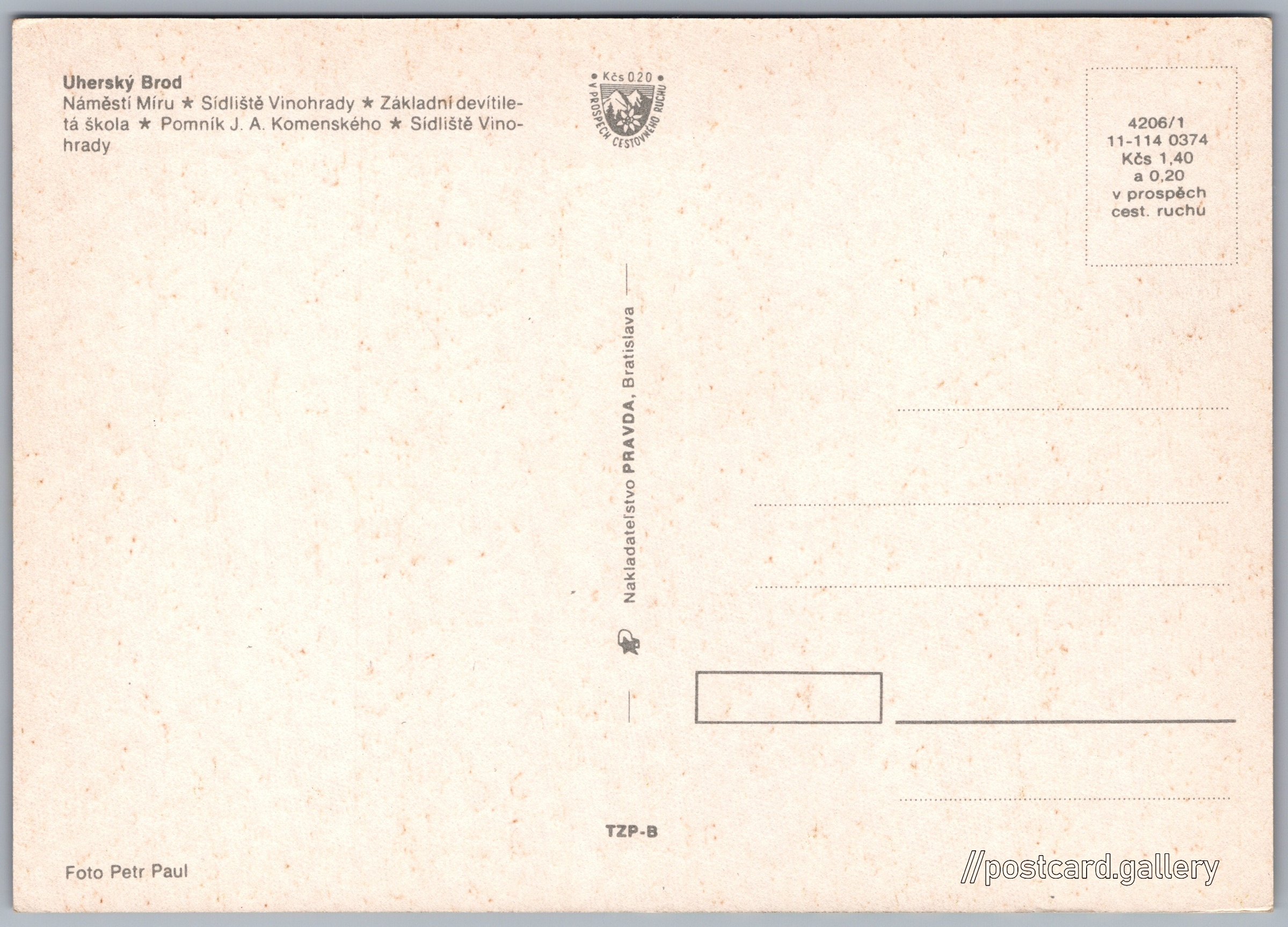 Uherský Brod Pokud chcete vidět pohlednice ve vyšším rozlišení nebo zobrazovat jejich zadní stranu, tak se prosím nejdříve přihlašte Přihlásit Zaregistrovat Uherský Brod Uherský Brod- Náměstí Míru- Sídliště Vinohrady- Základní devítiletá škola- Pomník J. A. Komenského- Sídliště Vinohrady Jazyk tištěného textu na pohlednici: čeština Pomník Jana Amose Komenského, Pomník, památník, Uherský Brod, Česko ukázat na mapě V blízkém okolí místa zobrazeného na pohlednici lze najít 3 jiné pohlednice. Zobrazit blízké pohlednice Vydavatel: Nakladateľstvo PRAVDA, Bratislava (Československo) Rok vydání pohlednice: březen, 1974 Velikost (š x v) a tvar pohlednice: 148 x 105 mm (5.83" x 4.13"), obdélník Osoby spjaté s touto pohlednicí: Petr Paul(Autor fotografie) Čistá pohlednice (neprošlá poštou) Ceny: Cena pohlednice: 1,40 Kčs (CSK) (+0,20 Kčs přípl. na tur. ruch) Kódy na pohlednici: 4206/1 11-114 0374 DiskuseVložit příspěvek Přidat novou složku ... Spravovat složky ...