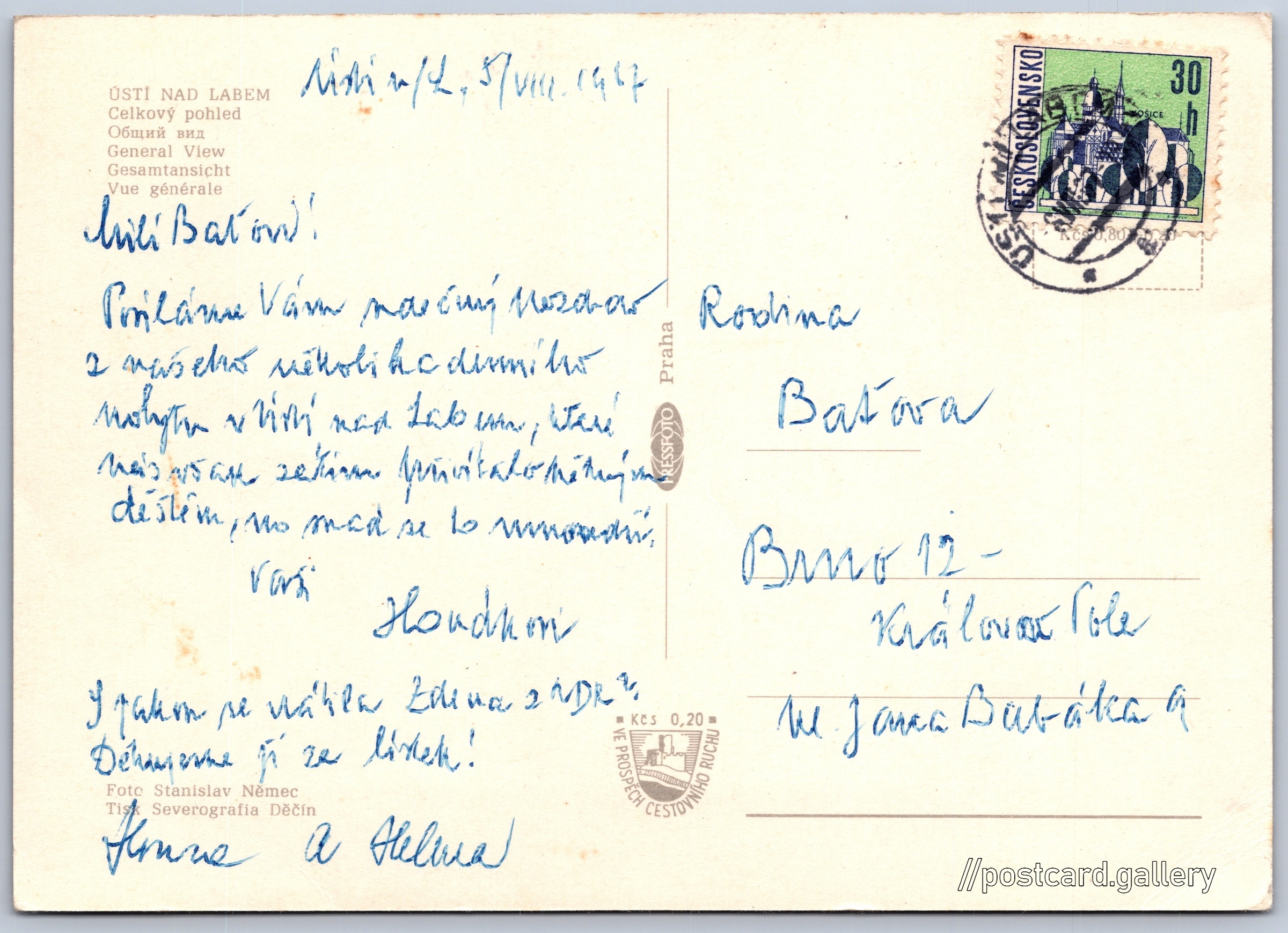 Ústí nad Labem, celkový pohled Pokud chcete vidět pohlednice ve vyšším rozlišení nebo zobrazovat jejich zadní stranu, tak se prosím nejdříve přihlašte Přihlásit Zaregistrovat ÚSTÍ NAD LABEM- Celkový pohled- Общий вид- General View- Gesamtansicht- Vue générale Jazyky tištěného textu na pohlednici: čeština, ruština, angličtina, němčina, francouzština Ústí nad Labem, Statutární město, Česko ukázat na mapě Vydavatel: PressFoto Praha (Československo) Odhadované datum vydání pohlednice: 1964 - 1967 Pomozte nám zpřesnit rok vzniku pohlednice Velikost (š x v) a tvar pohlednice: 147 x 104 mm (5.79" x 4.09"), obdélník Osoby spjaté s touto pohlednicí: Stanislav Němec(Autor fotografie) Prošlá poštou:Datum na razítku: 6.8.1967Datum napsání pohledu: 5.8.1967 Ceny: Příplatek na tur. ruch: 0,20 Kčs (CSK))Vyplacené známky: 0,30 Kčs (CSK) DiskuseVložit příspěvek Přidat novou složku ... Spravovat složky ...