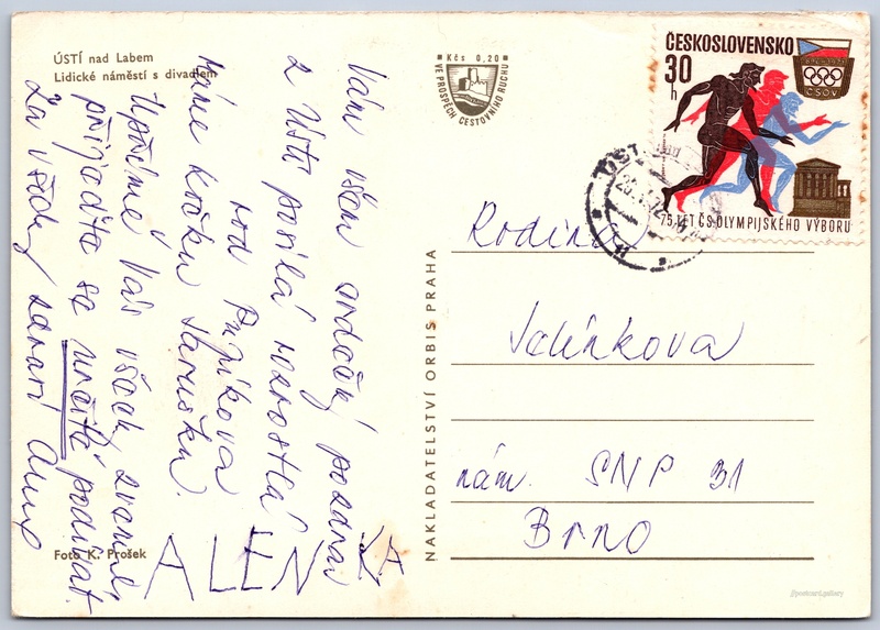 Ústí nad Labem, Lidické náměstí Pokud chcete vidět pohlednice ve vyšším rozlišení nebo zobrazovat jejich zadní stranu, tak se prosím nejdříve přihlašte Přihlásit Zaregistrovat Ústí nad LabemLidické náměstí s divadlem Jazyk tištěného textu na pohlednici: čeština Lidické náměstí, Ústí nad Labem, Ústí nad Labem ukázat na mapě V blízkém okolí místa zobrazeného na pohlednici lze najít 6 jiných pohlednic. Zobrazit blízké pohlednice Vydavatel: Nakladatelství Orbis (Československo) Odhadované datum vydání pohlednice: 1970 - 1972 Pomozte nám zpřesnit rok vzniku pohlednice Velikost (š x v) a tvar pohlednice: 149 x 105 mm (5.87" x 4.13"), obdélník Osoby spjaté s touto pohlednicí: K. Prošek(Autor fotografie) Prošlá poštou Ceny: Příplatek na tur. ruch: 0,20 Kčs (CSK))Vyplacené známky: 0,30 Kčs (CSK) DiskuseVložit příspěvek Přidat novou složku ... Spravovat složky ...