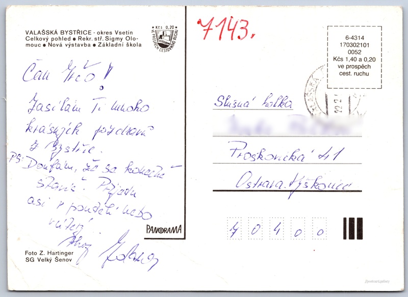 Valašská Bystřice Pokud chcete vidět pohlednice ve vyšším rozlišení nebo zobrazovat jejich zadní stranu, tak se prosím nejdříve přihlašte Přihlásit Zaregistrovat Valašská Bystřice VALAŠSKÁ BYSTŘICE - okres Vsetín- Celkový pohled- Rekr. stř. Sigmy Olomouc- Nová výstavba- Základní škola Jazyk tištěného textu na pohlednici: čeština Valašská Bystřice, Obec, Česko ukázat na mapě Vydavatel: Panorama (Československo) Datum vydání není známo Pomozte nám odhadnout datum vzniku pohlednice Velikost (š x v) a tvar pohlednice: 147 x 106 mm (5.79" x 4.17"), obdélník Osoby spjaté s touto pohlednicí: Zd. Hartinger(Autor fotografie) Prošlá poštou Ceny: Cena pohlednice: 1,40 Kčs (CSK) (+0,20 Kčs přípl. na tur. ruch) Kódy na pohlednici: 6-4314 170302101 0052 DiskuseVložit příspěvek Přidat novou složku ... Spravovat složky ...