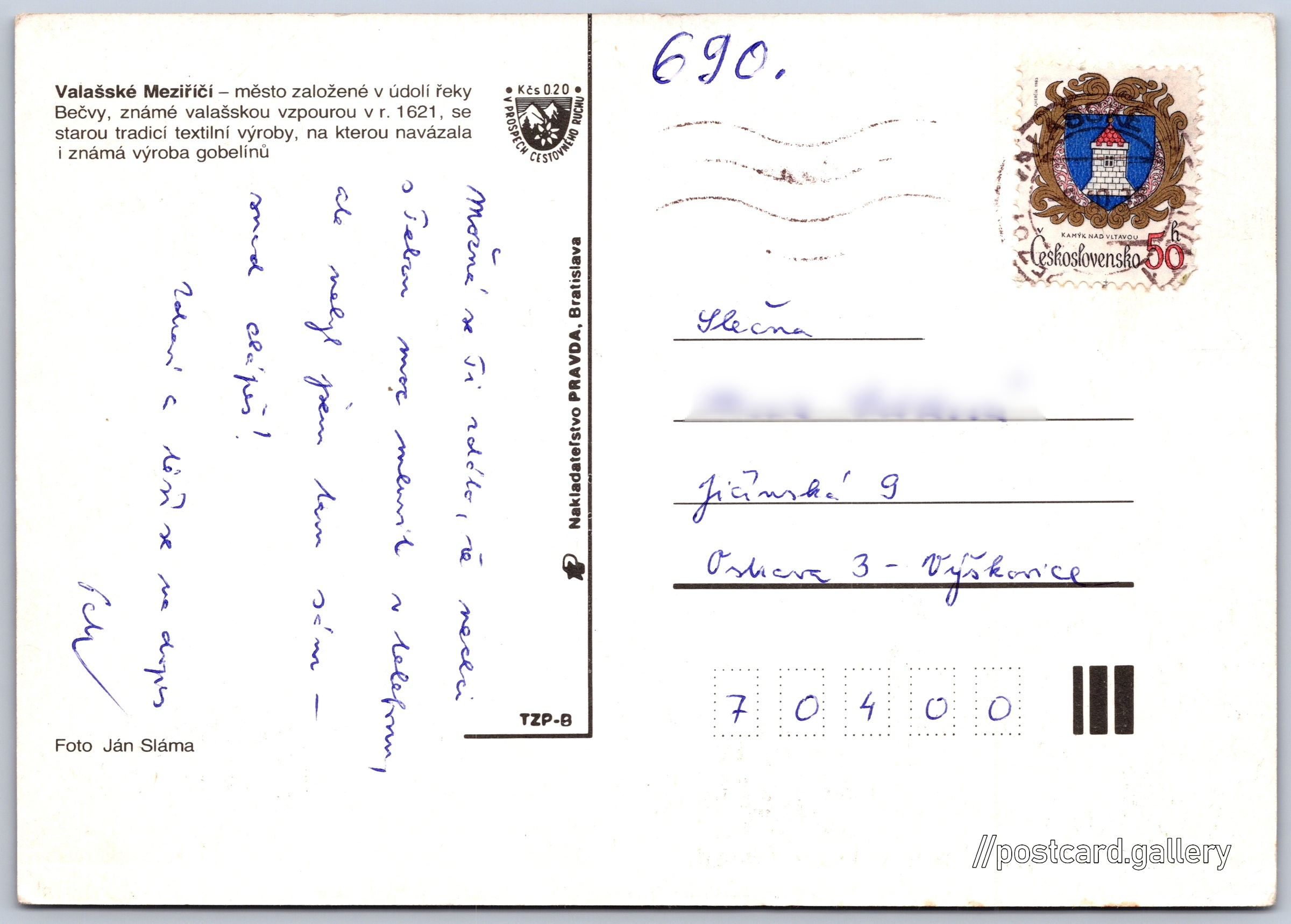 Valašské Meziříčí Pokud chcete vidět pohlednice ve vyšším rozlišení nebo zobrazovat jejich zadní stranu, tak se prosím nejdříve přihlašte Přihlásit Zaregistrovat Valašské Meziříčí Valašské Meziříčí - město založené v údolí řeky Bečvy, známé valašskou vzpourou v r. 1621, se starou tradicí textilní výroby, na kterou navázala i známá výroba gobelínů Jazyk tištěného textu na pohlednici: čeština Vsetínská 941/78, Valašské Meziříčí, 757 01, Vsetín ukázat na mapě Vydavatel: Nakladateľstvo PRAVDA, Bratislava (Československo) Odhadované datum vydání pohlednice: 1982 - 1985 Pomozte nám zpřesnit rok vzniku pohlednice Velikost (š x v) a tvar pohlednice: 150 x 106 mm (5.91" x 4.17"), obdélník Osoby spjaté s touto pohlednicí: Ján Sláma(Autor fotografie) Prošlá poštou:Datum na razítku: 9.10.1985 Ceny: Příplatek na tur. ruch: 0,20 Kčs (CSK))Vyplacené známky: 0,50 Kčs (CSK) DiskuseVložit příspěvek Přidat novou složku ... Spravovat složky ...