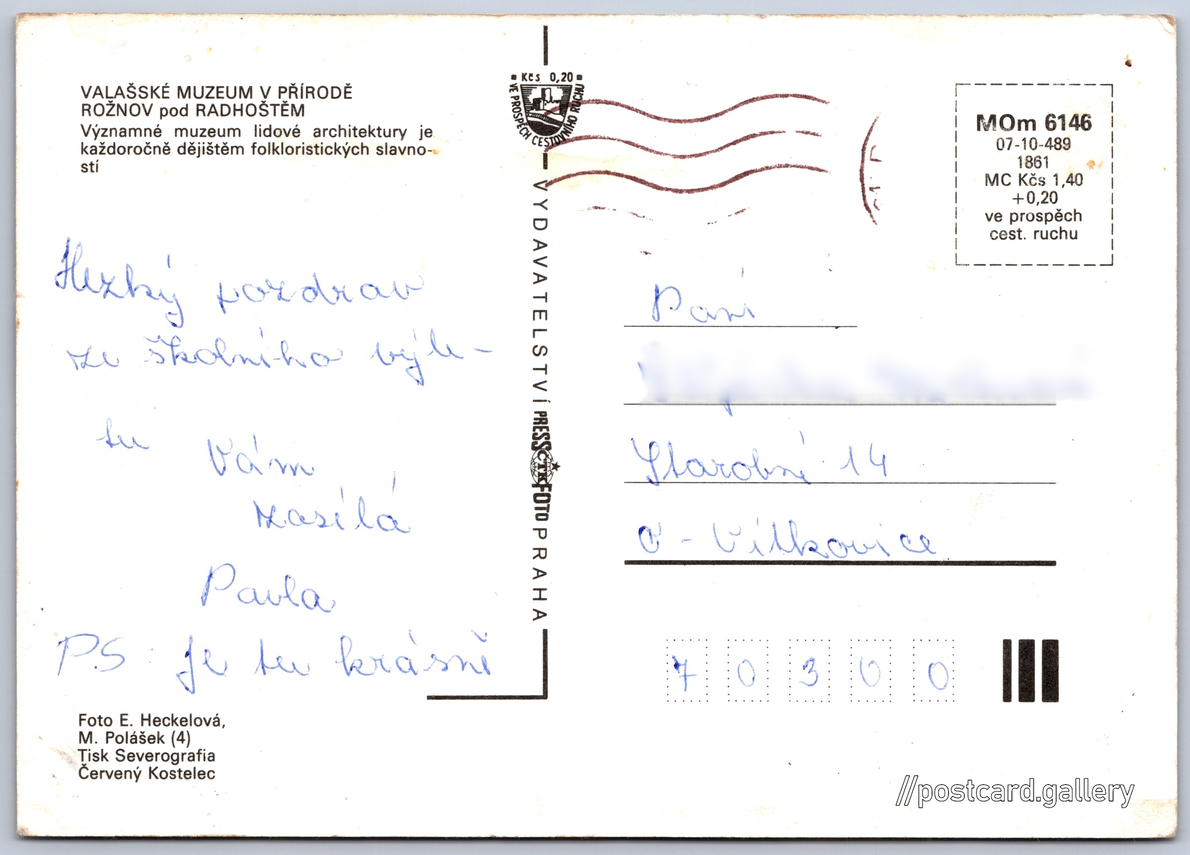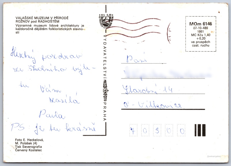 Valašské muzeum v přírodě 3/5 Pokud chcete vidět pohlednice ve vyšším rozlišení nebo zobrazovat jejich zadní stranu, tak se prosím nejdříve přihlašte Přihlásit Zaregistrovat Valašské muzeum v příroděRožnov pod Radhoštěm VALAŠSKÉ MUZEUM V PŘÍRODĚROŽNOV pod RADHOŠTĚMVýznamné muzeum lidové architektury je každoročně dějištěm folkloristických slavností. Jazyk tištěného textu na pohlednici: čeština Rožnov pod Radhoštěm, Vsetín ukázat na mapě Vydavatel: PressFoto Praha (Československo) Rok vydání pohlednice: 1984 Velikost (š x v) a tvar pohlednice: 148 x 105 mm (5.83" x 4.13"), obdélník Osoby spjaté s touto pohlednicí: Eva Heckelová(Autor fotografie) Miloš Polášek(Autor fotografie) Prošlá poštou Ceny: Cena pohlednice: 1,40 Kčs (CSK) (+0,20 Kčs přípl. na tur. ruch) Kódy na pohlednici: MOm 6146 07-10-489 1861 DiskuseVložit příspěvek Přidat novou složku ... Spravovat složky ...