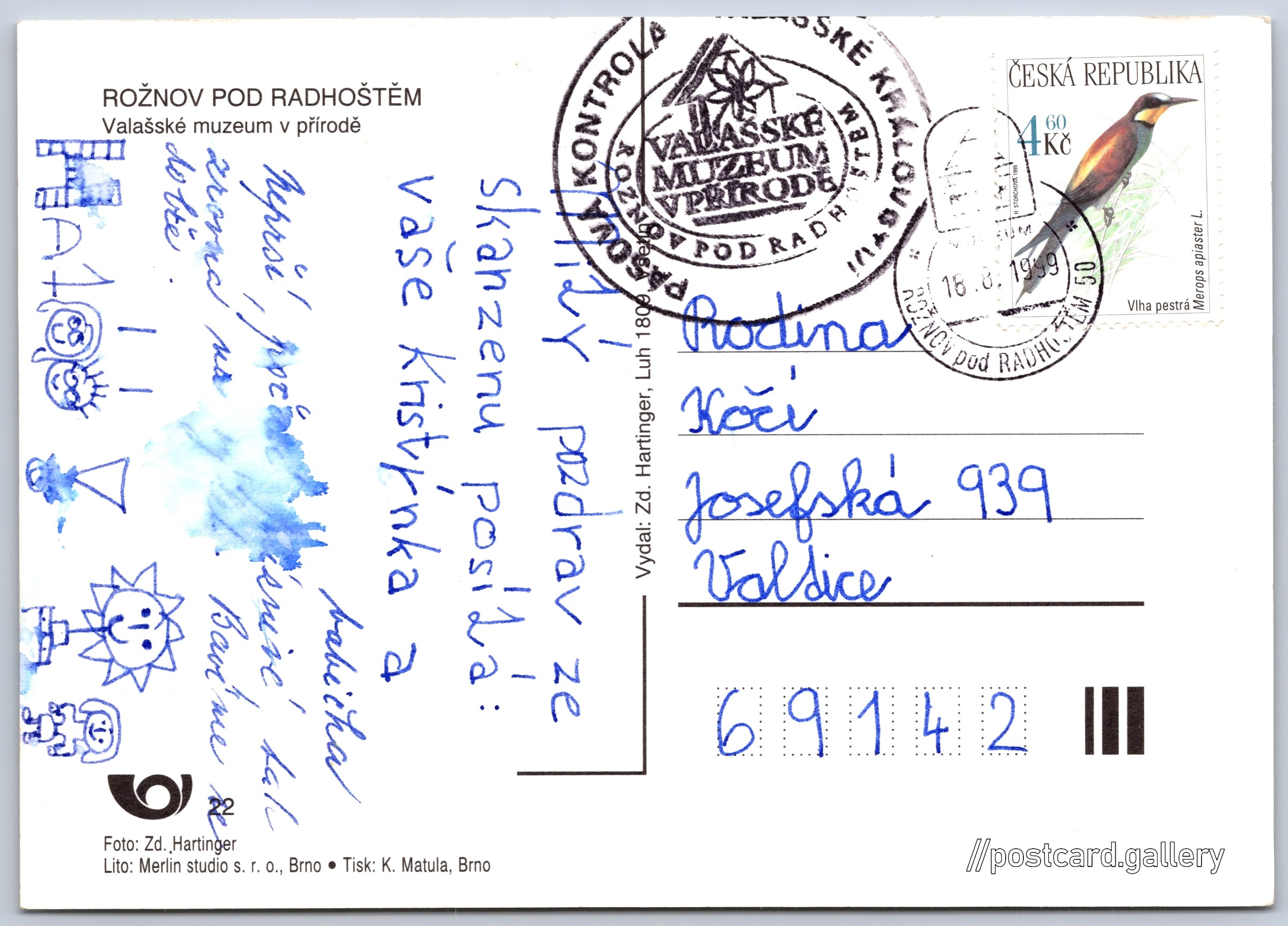 Valašské muzeum v přírodě Pokud chcete vidět pohlednice ve vyšším rozlišení nebo zobrazovat jejich zadní stranu, tak se prosím nejdříve přihlašte Přihlásit Zaregistrovat Valašské muzeum v příroděnárodní kulturní památka ROŽNOV POD RADHOŠTĚMValašské muzeum v přírodě Jazyk tištěného textu na pohlednici: čeština Valašské muzeum v přírodě, Muzeum v přírodě, skanzen, Palackého 634, Rožnov pod Radhoštěm, Česko ukázat na mapě V blízkém okolí místa zobrazeného na pohlednici lze najít 2 jiné pohlednice. Zobrazit blízké pohlednice Vydavatel: Zd. Hartinger (Česko) Odhadované datum vydání pohlednice: 1996 - 1999 Pomozte nám zpřesnit rok vzniku pohlednice Velikost (š x v) a tvar pohlednice: 147 x 105 mm (5.79" x 4.13"), obdélník Osoby spjaté s touto pohlednicí: Zd. Hartinger(Autor fotografie) Prošlá poštou:Datum na razítku: 18.8.1999 Ceny: Vyplacené známky: 4,60 Kč (CZK) DiskuseVložit příspěvek Přidat novou složku ... Spravovat složky ...