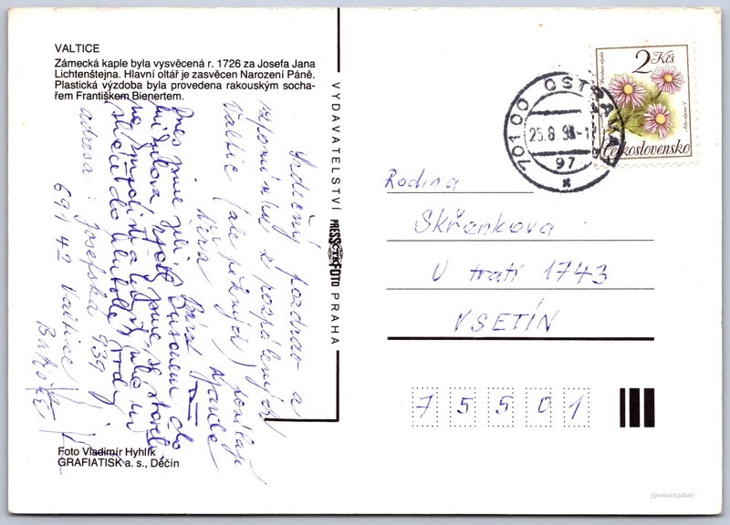 Valtice, zámecká kaple Pokud chcete vidět pohlednice ve vyšším rozlišení nebo zobrazovat jejich zadní stranu, tak se prosím nejdříve přihlašte Přihlásit Zaregistrovat VALTICEZámecká kaple byla vysvěcená r. 1726 za Josefa Jana Lichtenštejna. Hlavní oltář je zasvěcen Narození Páně. Plastická výzdoba byla provedena rakouským sochařem Františkem Bienertem. Jazyk tištěného textu na pohlednici: čeština Valtice, Břeclav ukázat na mapě V blízkém okolí místa zobrazeného na pohlednici lze najít 4 jiné pohlednice. Zobrazit blízké pohlednice Vydavatel: PressFoto Praha (Československo) Odhadované datum vydání pohlednice: 1987 - 1990 Pomozte nám zpřesnit rok vzniku pohlednice Velikost (š x v) a tvar pohlednice: 148 x 105 mm (5.83" x 4.13"), obdélník Osoby spjaté s touto pohlednicí: Vladimír Hyhlík(Autor fotografie) Prošlá poštou:Datum na razítku: 25.8.1990 Ceny: Vyplacené známky: 2,00 Kčs (CSK) DiskuseVložit příspěvek Přidat novou složku ... Spravovat složky ...