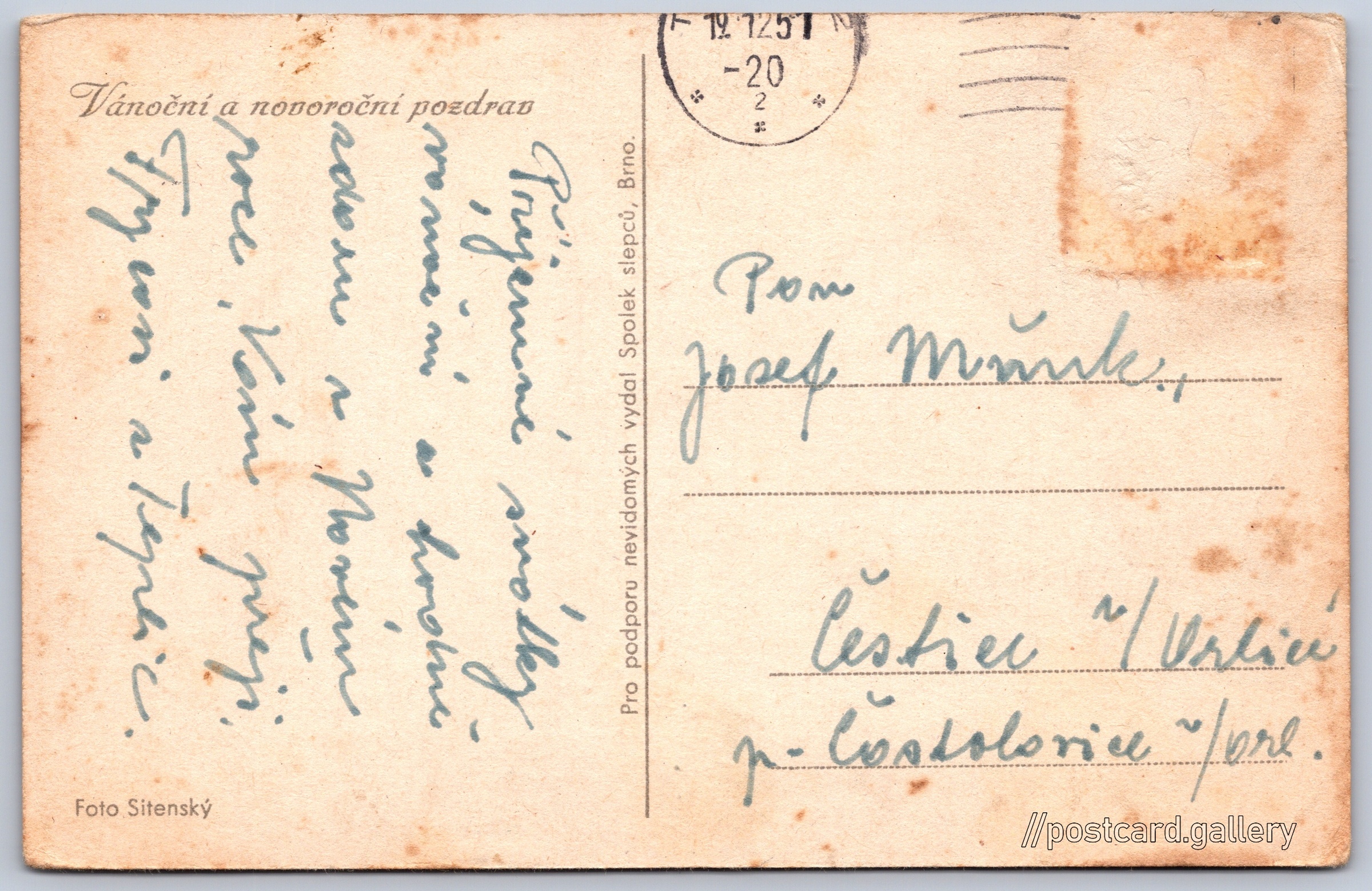 Vánoční a novoroční pozdrav Pokud chcete vidět pohlednice ve vyšším rozlišení nebo zobrazovat jejich zadní stranu, tak se prosím nejdříve přihlašte Přihlásit Zaregistrovat Vánoční a novoroční pozdravPro podporu nevidomých vydal Spolek slepců, Brno. Jazyk tištěného textu na pohlednici: čeština Vydavatel: Spolek slepců, Brno (Československo) Odhadované datum vydání pohlednice: 1948 - 1951 Pomozte nám zpřesnit rok vzniku pohlednice Velikost (š x v) a tvar pohlednice: 139 x 90 mm (5.47" x 3.54"), obdélník Osoby spjaté s touto pohlednicí: Daniel Sitenský(Autor fotografie) Prošlá poštou:Datum na razítku: 19.12.1951 DiskuseVložit příspěvek Přidat novou složku ... Spravovat složky ...