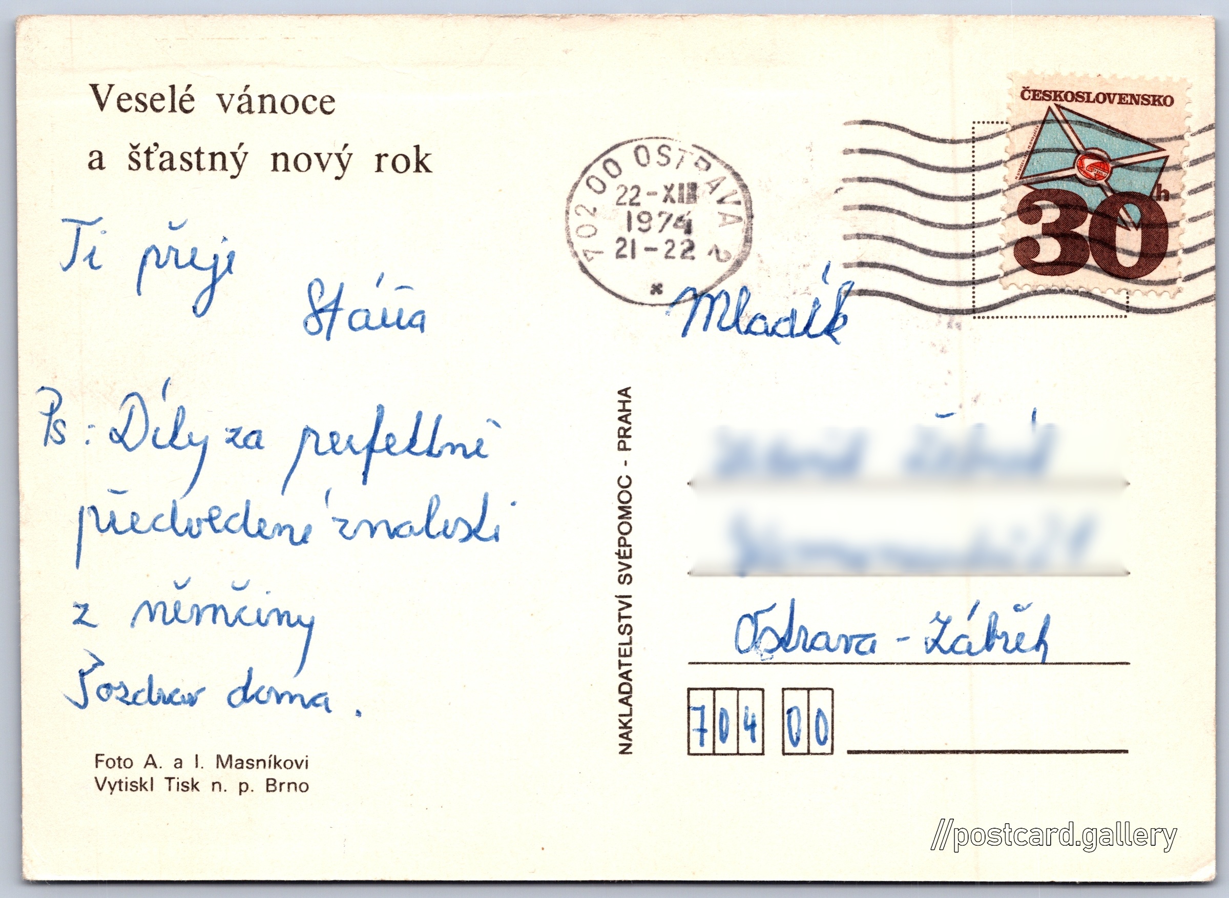 Vánoční a novoroční přání, ozdobený stromeček, hodiny Pokud chcete vidět pohlednice ve vyšším rozlišení nebo zobrazovat jejich zadní stranu, tak se prosím nejdříve přihlašte Přihlásit Zaregistrovat Veselé vánoce a šťastný nový rok Jazyk tištěného textu na pohlednici: čeština Vydavatel: Nakladatelství Svépomoc, Praha (Československo) Odhadované datum vydání pohlednice: 1971 - 1974 Pomozte nám zpřesnit rok vzniku pohlednice Velikost (š x v) a tvar pohlednice: 146 x 105 mm (5.75" x 4.13"), obdélník Osoby spjaté s touto pohlednicí: A. Masníková(Autor fotografie) I. Masník(Autor fotografie) Prošlá poštou:Datum na razítku: 22.12.1974 Ceny: Vyplacené známky: 0,30 Kčs (CSK) DiskuseVložit příspěvek Přidat novou složku ... Spravovat složky ...