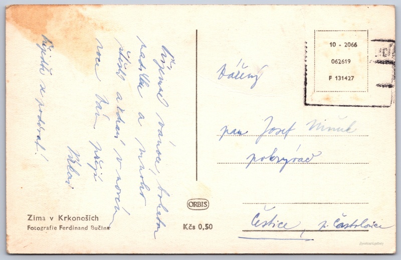Vánoční a novoroční přání, zasněžená krajina 2/10 Pokud chcete vidět pohlednice ve vyšším rozlišení nebo zobrazovat jejich zadní stranu, tak se prosím nejdříve přihlašte Přihlásit Zaregistrovat Radostné vánoce a veselý Nový rok Zima v Krkonoších Jazyk tištěného textu na pohlednici: čeština Vydavatel: Nakladatelství Orbis (Československo) Datum vydání není známo Pomozte nám odhadnout datum vzniku pohlednice Velikost (š x v) a tvar pohlednice: 138 x 89 mm (5.43" x 3.50"), obdélník Osoby spjaté s touto pohlednicí: Ferdinand Bučina(Autor fotografie) Prošlá poštou Ceny: Cena pohlednice: 0,50 Kčs (CSK) Kódy na pohlednici: 10-2066 062619 F 131427 DiskuseVložit příspěvek Přidat novou složku ... Spravovat složky ...