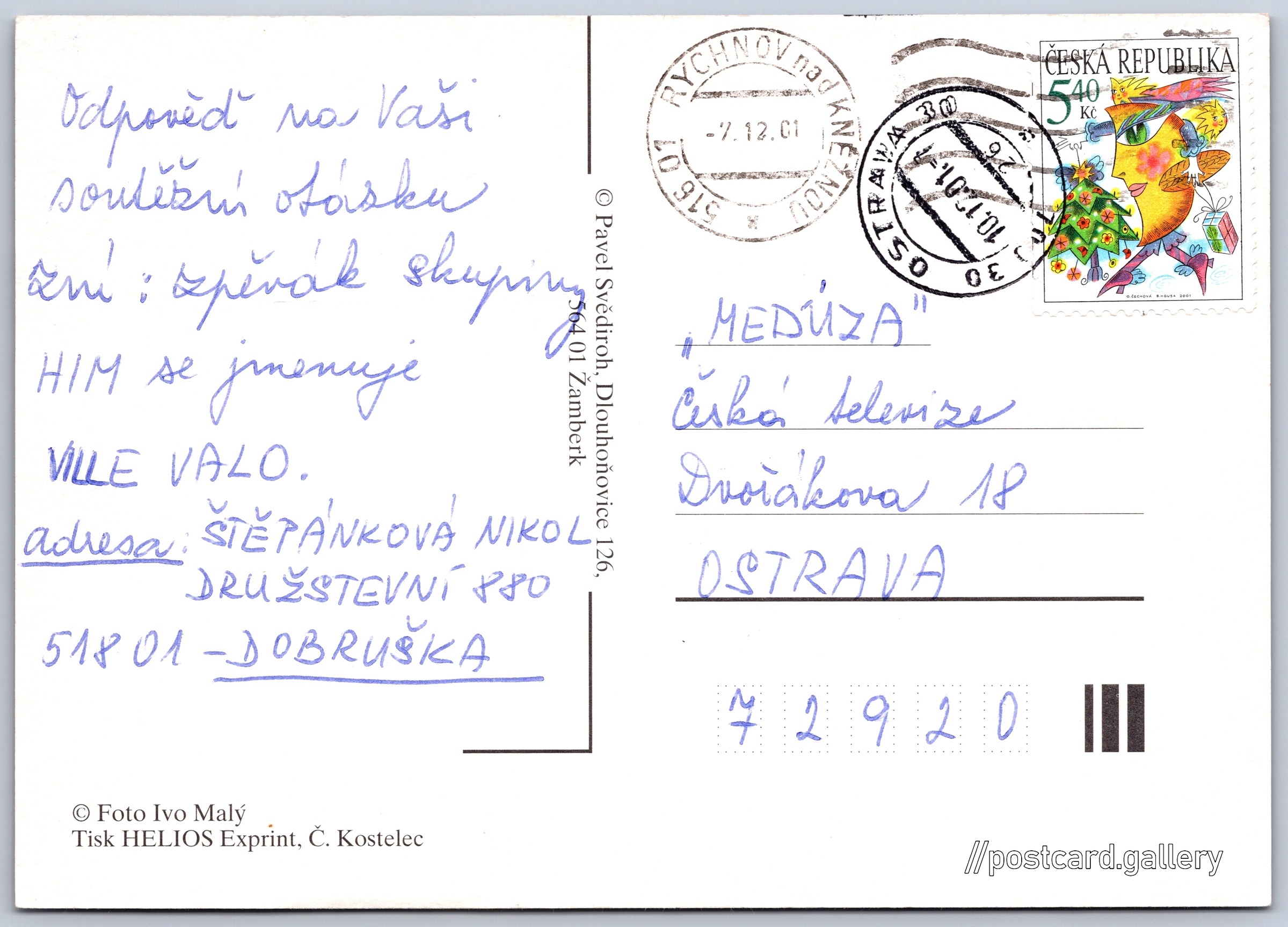 Vánoční pozdrav z Dobrušky 6/7 Pokud chcete vidět pohlednice ve vyšším rozlišení nebo zobrazovat jejich zadní stranu, tak se prosím nejdříve přihlašte Přihlásit Zaregistrovat Vánoční pozdrav z Dobrušky Jazyk tištěného textu na pohlednici: čeština nám. F. L. Věka 1, Dobruška, 518 01, Rychnov nad Kněžnou ukázat na mapě V blízkém okolí místa zobrazeného na pohlednici lze najít 7 jiných pohlednic. Zobrazit blízké pohlednice Vydavatel: Pavel Svědiroh (Česko) Odhadované datum vydání pohlednice: 1998 - 2001 Pomozte nám zpřesnit rok vzniku pohlednice Velikost (š x v) a tvar pohlednice: 147 x 104 mm (5.79" x 4.09"), obdélník Osoby spjaté s touto pohlednicí: Ivo Malý(Autor fotografie) Prošlá poštou:Datum na razítku: 7.12.2001 Ceny: Vyplacené známky: 5,40 Kč (CZK) DiskuseVložit příspěvek Přidat novou složku ... Spravovat složky ...