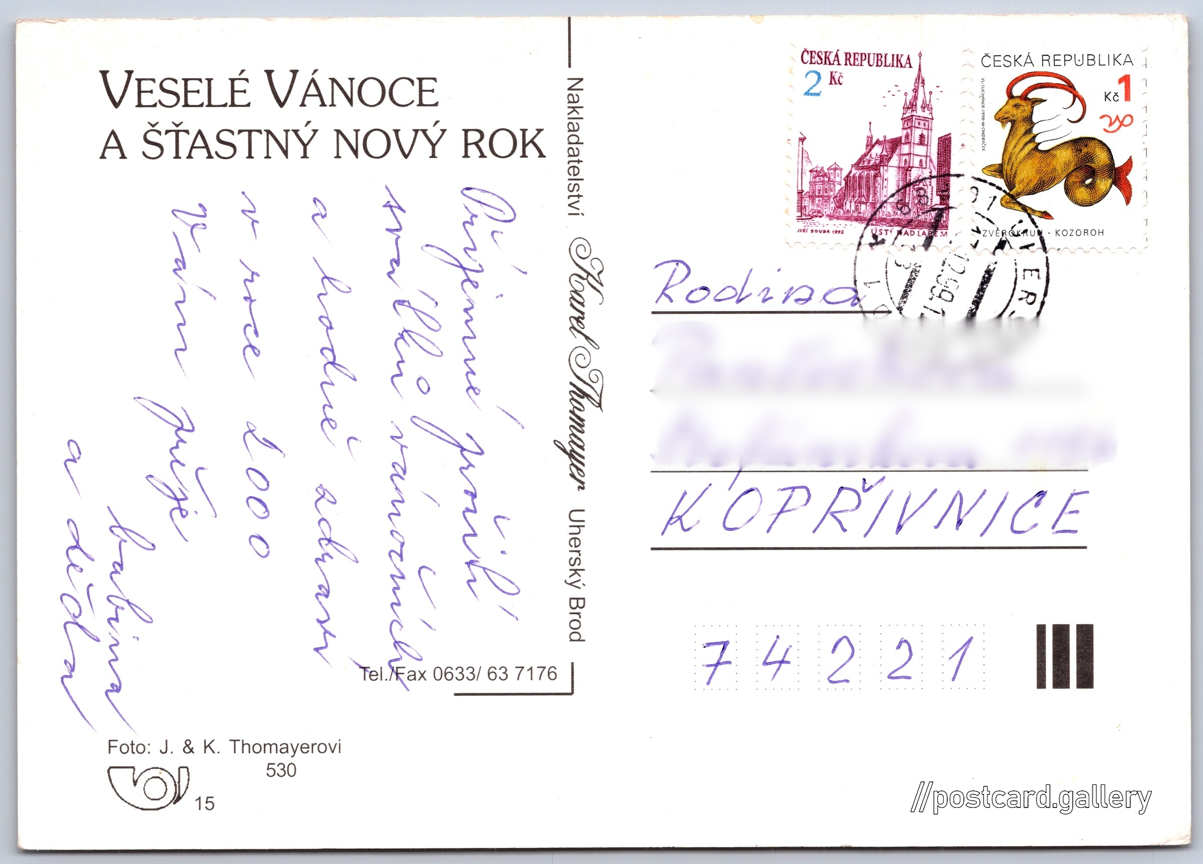 Vánoční přání, podkova Pokud chcete vidět pohlednice ve vyšším rozlišení nebo zobrazovat jejich zadní stranu, tak se prosím nejdříve přihlašte Přihlásit Zaregistrovat Šťastné vánoce VESELÉ VÁNOCE A ŠŤASTNÝ NOVÝ ROK Jazyk tištěného textu na pohlednici: čeština Vydavatel: Nakladatelství Thomayer (Československo) Odhadované datum vydání pohlednice: 1996 - 1999 Pomozte nám zpřesnit rok vzniku pohlednice Velikost (š x v) a tvar pohlednice: 148 x 105 mm (5.83" x 4.13"), obdélník Osoby spjaté s touto pohlednicí: Karel Thomayer(Autor fotografie) J. Thomayer(Autor fotografie) Prošlá poštou:Datum na razítku: 17.12.1999 Ceny: Vyplacené známky: 3,00 Kč (CZK) Kódy na pohlednici: 530 DiskuseVložit příspěvek Přidat novou složku ... Spravovat složky ...