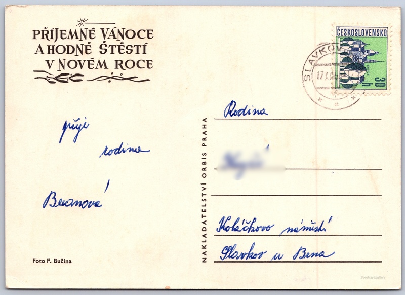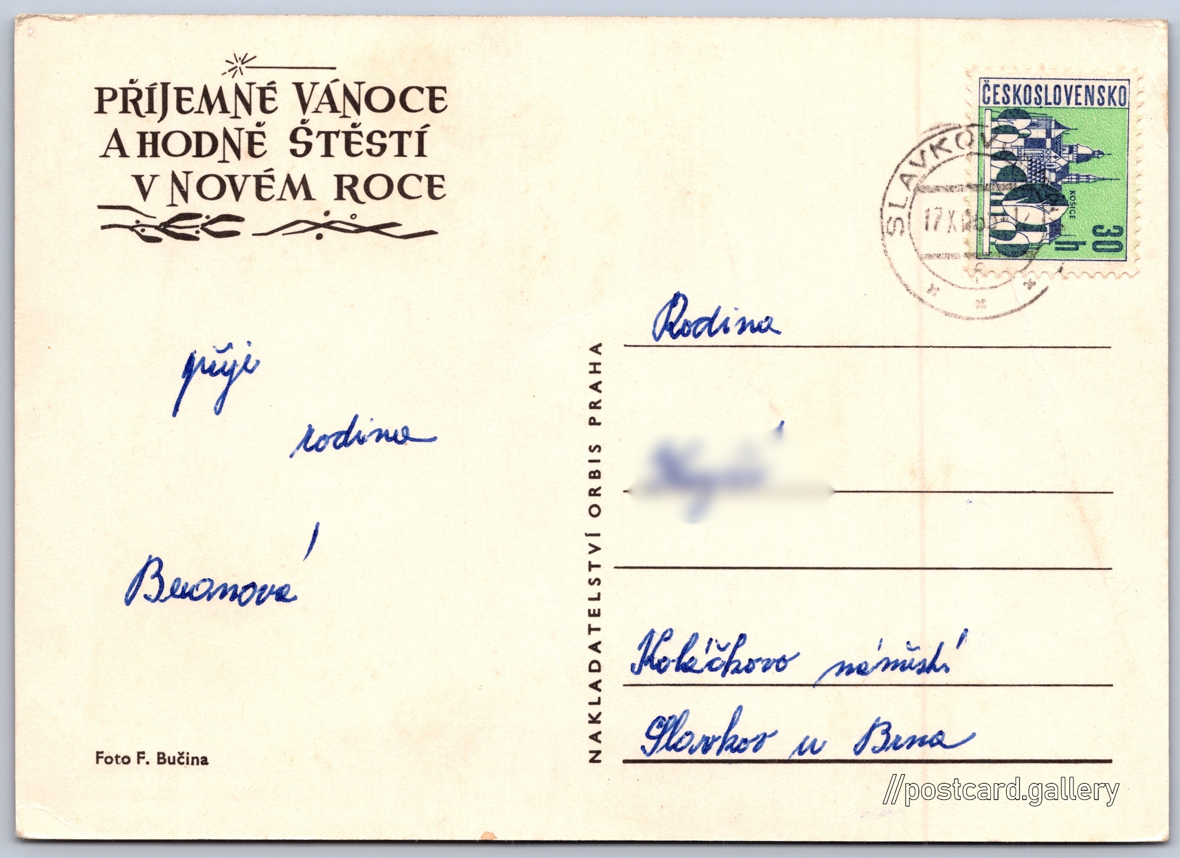 Vánoční přání Pokud chcete vidět pohlednice ve vyšším rozlišení nebo zobrazovat jejich zadní stranu, tak se prosím nejdříve přihlašte Přihlásit Zaregistrovat PŘÍJEMNÉ VÁNOCE A HODNĚ ŠTĚSTÍ V NOVÉM ROCE Jazyk tištěného textu na pohlednici: čeština Vydavatel: Nakladatelství Orbis (Československo) Datum vydání není známo Pomozte nám odhadnout datum vzniku pohlednice Velikost (š x v) a tvar pohlednice: 147 x 105 mm (5.79" x 4.13"), obdélník Osoby spjaté s touto pohlednicí: Ferdinand Bučina(Autor fotografie) Prošlá poštou Ceny: Vyplacené známky: 0,30 Kčs (CSK) DiskuseVložit příspěvek Přidat novou složku ... Spravovat složky ...