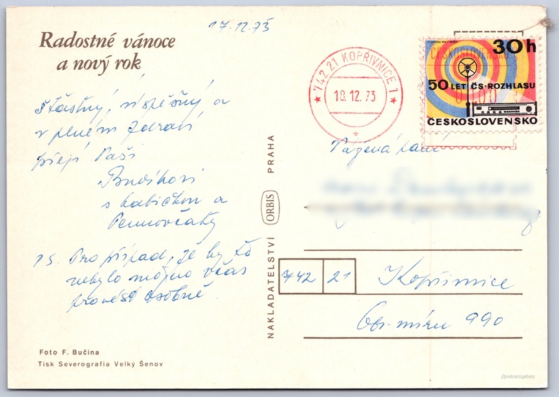 Vánoční přání Pokud chcete vidět pohlednice ve vyšším rozlišení nebo zobrazovat jejich zadní stranu, tak se prosím nejdříve přihlašte Přihlásit Zaregistrovat Radostné vánoce a nový rok Jazyk tištěného textu na pohlednici: čeština Vydavatel: Nakladatelství Orbis (Československo) Odhadované datum vydání pohlednice: 1970 - 1973 Pomozte nám zpřesnit rok vzniku pohlednice Velikost (š x v) a tvar pohlednice: 148 x 104 mm (5.83" x 4.09"), obdélník Osoby spjaté s touto pohlednicí: Ferdinand Bučina(Autor fotografie) Prošlá poštou:Datum na razítku: 18.12.1973Datum napsání pohledu: 17.12.1973 Ceny: Vyplacené známky: 0,30 Kčs (CSK) DiskuseVložit příspěvek Přidat novou složku ... Spravovat složky ...