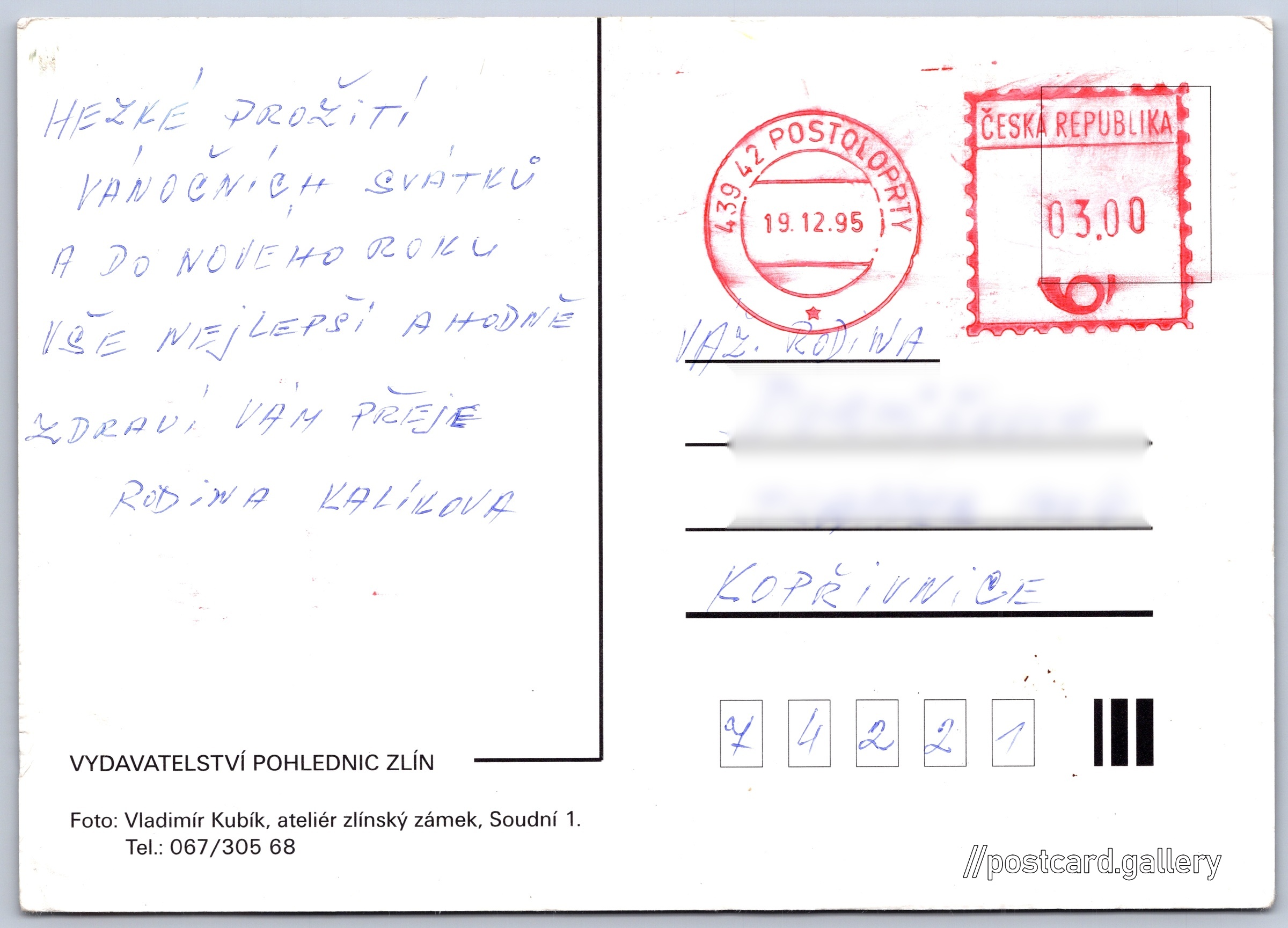 Vánoční přání Pokud chcete vidět pohlednice ve vyšším rozlišení nebo zobrazovat jejich zadní stranu, tak se prosím nejdříve přihlašte Přihlásit Zaregistrovat Jazyk tištěného textu na pohlednici: čeština Odhadované datum vydání pohlednice: 1993 - 1995 Pomozte nám zpřesnit rok vzniku pohlednice Velikost (š x v) a tvar pohlednice: 148 x 105 mm (5.83" x 4.13"), obdélník Osoby spjaté s touto pohlednicí: Vladimír Kubík(Autor fotografie) Prošlá poštou:Datum na razítku: 19.12.1995 Ceny: Vyplacené známky: 3,00 Kč (CZK) DiskuseVložit příspěvek Přidat novou složku ... Spravovat složky ...