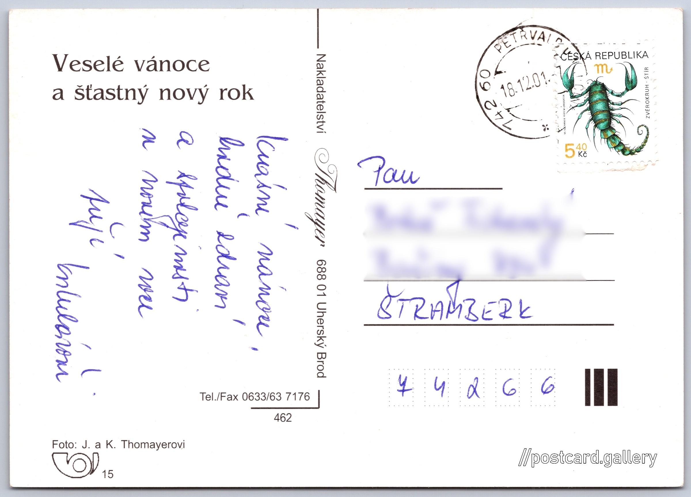 Vánoční přání Pokud chcete vidět pohlednice ve vyšším rozlišení nebo zobrazovat jejich zadní stranu, tak se prosím nejdříve přihlašte Přihlásit Zaregistrovat Šťastné vánoce Veselé vánoce a šťastný nový rok Jazyk tištěného textu na pohlednici: čeština Vydavatel: Nakladatelství Thomayer (Československo) Odhadované datum vydání pohlednice: 1998 - 2001 Pomozte nám zpřesnit rok vzniku pohlednice Velikost (š x v) a tvar pohlednice: 147 x 105 mm (5.79" x 4.13"), obdélník Osoby spjaté s touto pohlednicí: Karel Thomayer(Autor fotografie) J. Thomayer(Autor fotografie) Prošlá poštou:Datum na razítku: 18.12.2001 Ceny: Vyplacené známky: 5,40 Kč (CZK) Kódy na pohlednici: 462 ČP 15 DiskuseVložit příspěvek Přidat novou složku ... Spravovat složky ...