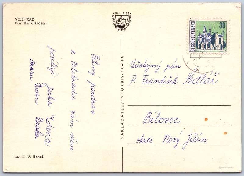 Velehrad, bazilika a klášter Pokud chcete vidět pohlednice ve vyšším rozlišení nebo zobrazovat jejich zadní stranu, tak se prosím nejdříve přihlašte Přihlásit Zaregistrovat VELEHRADBasilika a klášter Jazyk tištěného textu na pohlednici: čeština Velehrad, Uherské Hradiště ukázat na mapě V blízkém okolí místa zobrazeného na pohlednici lze najít 16 jiných pohlednic. Zobrazit blízké pohlednice Vydavatel: Nakladatelství Orbis (Československo) Odhadované datum vydání pohlednice: 1967 - 1970 Pomozte nám zpřesnit rok vzniku pohlednice Velikost (š x v) a tvar pohlednice: 148 x 105 mm (5.83" x 4.13"), obdélník Osoby spjaté s touto pohlednicí: V. Beneš(Autor fotografie) Prošlá poštou:Datum na razítku: 7.9.1970 Ceny: Příplatek na tur. ruch: 0,20 Kčs (CSK))Vyplacené známky: 0,30 Kčs (CSK) DiskuseVložit příspěvek Přidat novou složku ... Spravovat složky ...