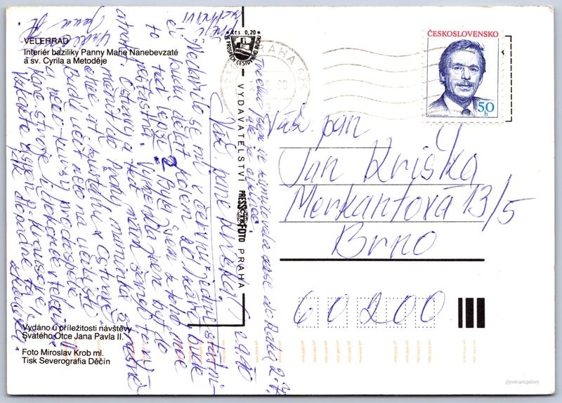 Velehrad, interiér baziliky 5/16 Pokud chcete vidět pohlednice ve vyšším rozlišení nebo zobrazovat jejich zadní stranu, tak se prosím nejdříve přihlašte Přihlásit Zaregistrovat VELEHRADInteriér baziliky Panny Marie Nanebevzaté a sv. Cyrila a Metoděje Jazyk tištěného textu na pohlednici: čeština Nádvoří 37, 687 06 Velehrad, Czechia ukázat na mapě V blízkém okolí místa zobrazeného na pohlednici lze najít 16 jiných pohlednic. Zobrazit blízké pohlednice Vydavatel: PressFoto Praha (Československo) Odhadované datum vydání pohlednice: 1987 - 1990 Pomozte nám zpřesnit rok vzniku pohlednice Velikost (š x v) a tvar pohlednice: 148 x 105 mm (5.83" x 4.13"), obdélník Osoby spjaté s touto pohlednicí: Miroslav Krob ml.(Autor fotografie) Prošlá poštou:Datum na razítku: 3.9.1990 Ceny: Příplatek na tur. ruch: 0,20 Kčs (CSK))Vyplacené známky: 0,50 Kčs (CSK) DiskuseVložit příspěvek Přidat novou složku ... Spravovat složky ...