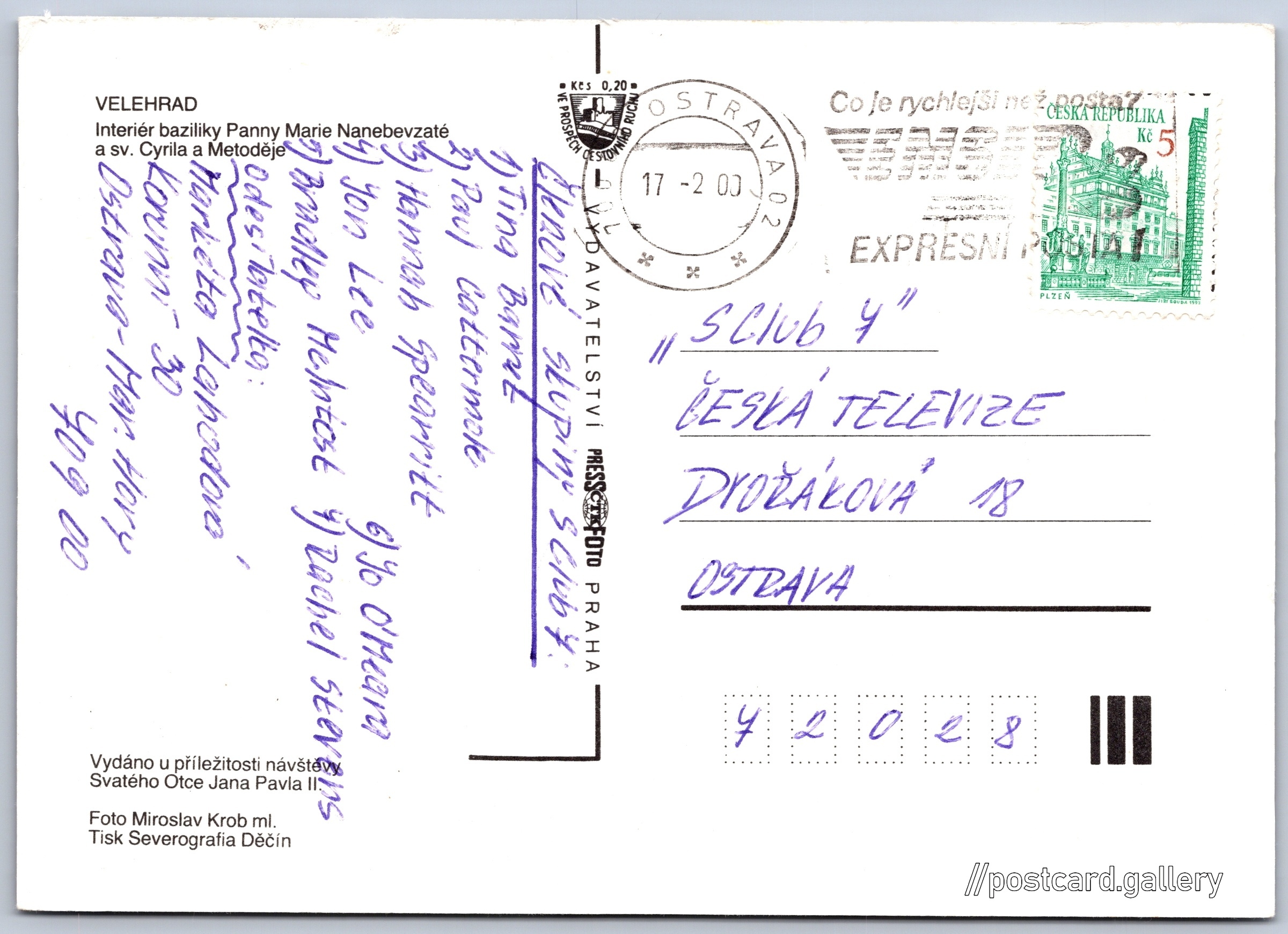 Velehrad, interiér baziliky Pokud chcete vidět pohlednice ve vyšším rozlišení nebo zobrazovat jejich zadní stranu, tak se prosím nejdříve přihlašte Přihlásit Zaregistrovat VELEHRADInteriér baziliky Panny Marie Nanebevzaté a sv. Cyrila a MetodějeVydáno u příležitosti návštěvy Svatého Otce Jana Pavla II Jazyk tištěného textu na pohlednici: čeština Nádvoří 37, 687 06 Velehrad, Czechia ukázat na mapě V blízkém okolí místa zobrazeného na pohlednici lze najít 16 jiných pohlednic. Zobrazit blízké pohlednice Vydavatel: PressFoto Praha (Československo) Rok vydání pohlednice: 1990 Velikost (š x v) a tvar pohlednice: 148 x 105 mm (5.83" x 4.13"), obdélník Osoby spjaté s touto pohlednicí: Miroslav Krob ml.(Autor fotografie) Jan Pavel II.(Obsah pohlednice) Prošlá poštou:Datum na razítku: 17.2.2000 Ceny: Příplatek na tur. ruch: 0,20 Kčs (CSK))Vyplacené známky: 5,00 Kč (CZK) DiskuseVložit příspěvek Přidat novou složku ... Spravovat složky ...