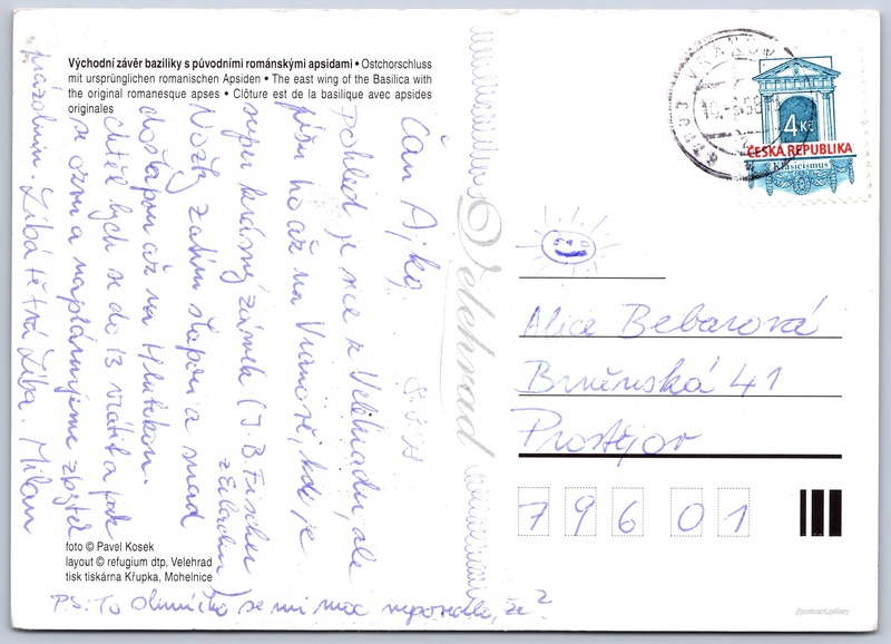 Velehrad, východní závěr bazilky 1/4 Pokud chcete vidět pohlednice ve vyšším rozlišení nebo zobrazovat jejich zadní stranu, tak se prosím nejdříve přihlašte Přihlásit Zaregistrovat Velehrad - Východní závěr baziliky s původními románskými apsidami- Ostchorschluss mit ursprünglichen romanischen Apsiden- The east wing of the Basilica with the original romanesque apses- Clôture est de la basilique avec apsides originales Jazyk tištěného textu na pohlednici: čeština Velehrad ev. č. 37, Velehrad, 687 06, Uherské Hradiště ukázat na mapě V blízkém okolí místa zobrazeného na pohlednici lze najít 16 jiných pohlednic. Zobrazit blízké pohlednice Odhadované datum vydání pohlednice: 1995 - 1998 Pomozte nám zpřesnit rok vzniku pohlednice Velikost (š x v) a tvar pohlednice: 147 x 106 mm (5.79" x 4.17"), obdélník Osoby spjaté s touto pohlednicí: Pavel Kosek(Autor fotografie) Prošlá poštou:Datum napsání pohledu: 8.3.1998 Ceny: Vyplacené známky: 4,00 Kč (CZK) DiskuseVložit příspěvek Přidat novou složku ... Spravovat složky ...