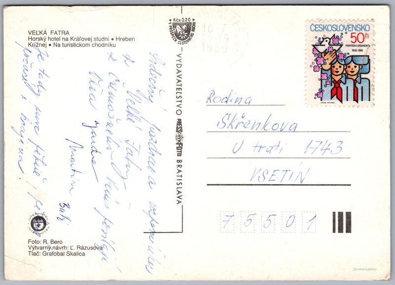Veľká Fatra, Kráľova studňa Pokud chcete vidět pohlednice ve vyšším rozlišení nebo zobrazovat jejich zadní stranu, tak se prosím nejdříve přihlašte Přihlásit Zaregistrovat Veľká Fatra VEĽKÁ FATRA- Horský hotel na Kráľovej studni- Hrebeň Krížnej- Na turistickom chodníku Jazyk tištěného textu na pohlednici: slovenština Horský hotel Kráľova Studňa, Chata, bouda, Dolný Harmanec 92, Dolný Harmanec, Slovensko ukázat na mapě Vydavatel: PressFoto Bratislava (Československo) Datum vydání není známo Pomozte nám odhadnout datum vzniku pohlednice Velikost (š x v) a tvar pohlednice: 148 x 105 mm (5.83" x 4.13"), obdélník Osoby spjaté s touto pohlednicí: Ing. R. Bero(Autor fotografie) Ľ. Rázusová(Design pohlednice) Prošlá poštou Ceny: Příplatek na tur. ruch: 0,20 Kčs (CSK))Vyplacené známky: 0,50 Kčs (CSK) DiskuseVložit příspěvek Přidat novou složku ... Spravovat složky ...