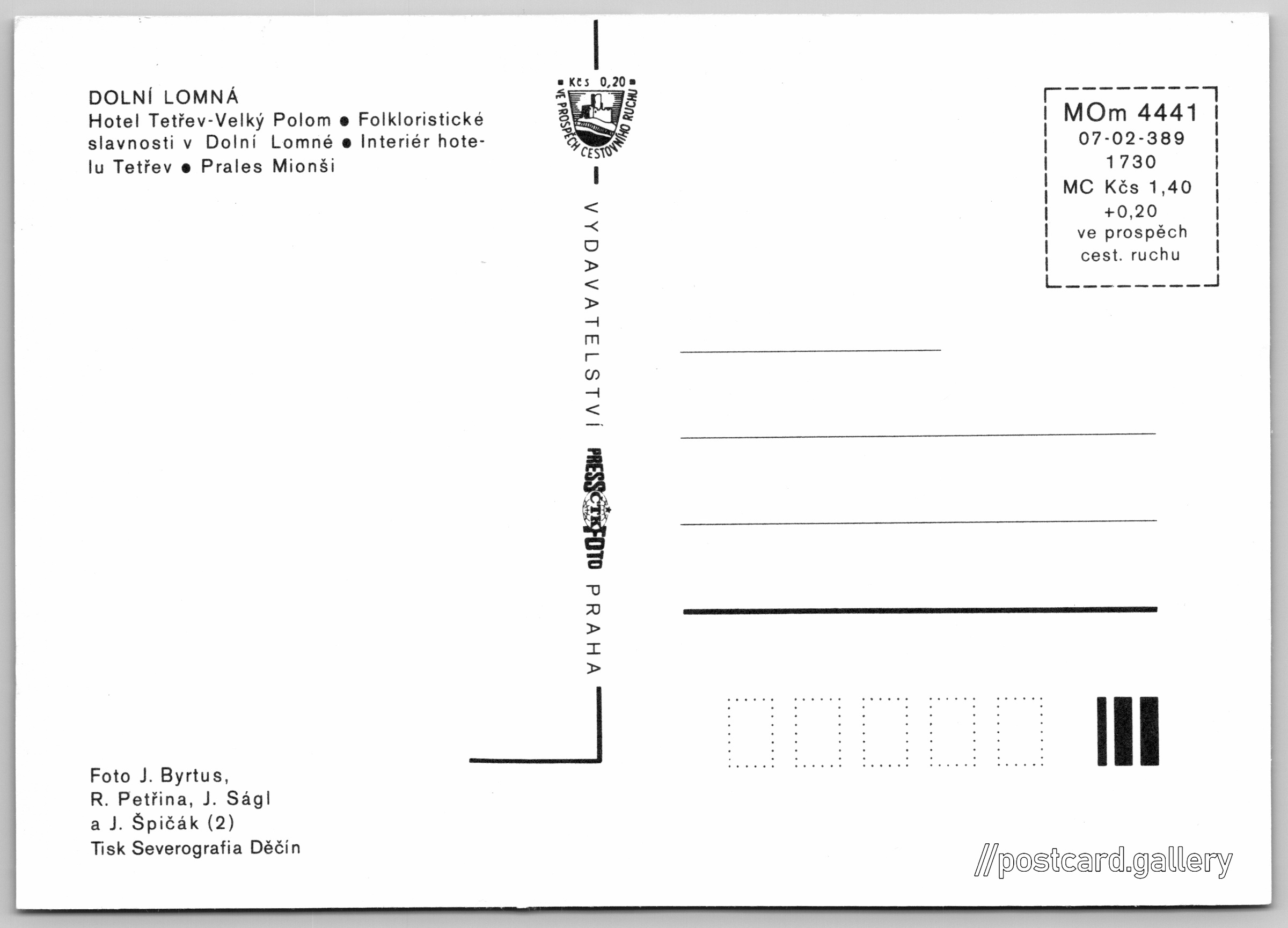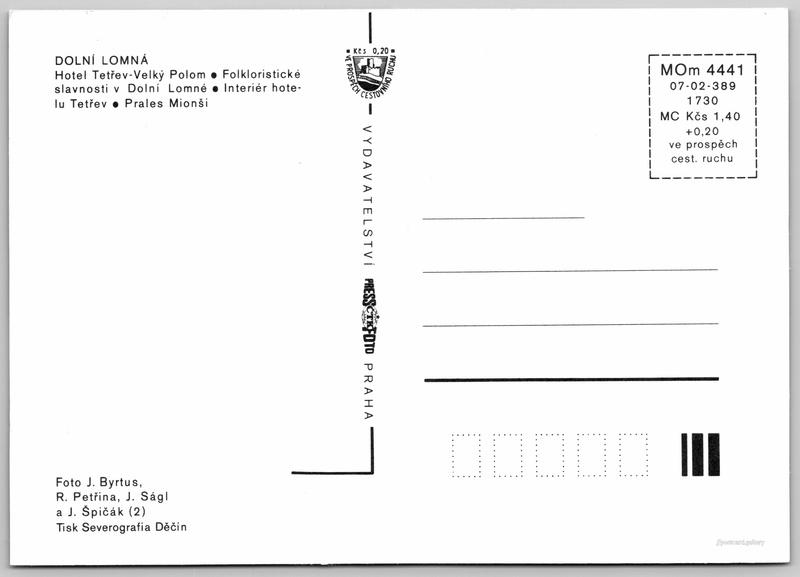 Velký Polom, hotel Tetřev Pokud chcete vidět pohlednice ve vyšším rozlišení nebo zobrazovat jejich zadní stranu, tak se prosím nejdříve přihlašte Přihlásit Zaregistrovat Velký PolomHotel Tetřev DOLNÍ LOMNÁ- Hotel Tetřev - Velký Polom- Folkloristické slavnosti v Dolní Lomné- Interiér hotelu Tetřev- Prales Mionši Jazyk tištěného textu na pohlednici: čeština Dolní Lomná, Obec, Česko ukázat na mapě V blízkém okolí místa zobrazeného na pohlednici lze najít 11 jiných pohlednic. Zobrazit blízké pohlednice Vydavatel: PressFoto Praha (Československo) Rok vydání pohlednice: 1983 Velikost (š x v) a tvar pohlednice: 147 x 104 mm (5.79" x 4.09"), obdélník Osoby spjaté s touto pohlednicí: Jan Byrtus(Autor fotografie) R. Petřina(Autor fotografie) Jan Ságl(Autor fotografie) Josef Špičák(Autor fotografie) Čistá pohlednice (neprošlá poštou) Ceny: Cena pohlednice: 1,40 Kčs (CSK) (+0,20 Kčs přípl. na tur. ruch) Kódy na pohlednici: MOm 4441 07-02-389 1730 DiskuseVložit příspěvek Přidat novou složku ... Spravovat složky ...