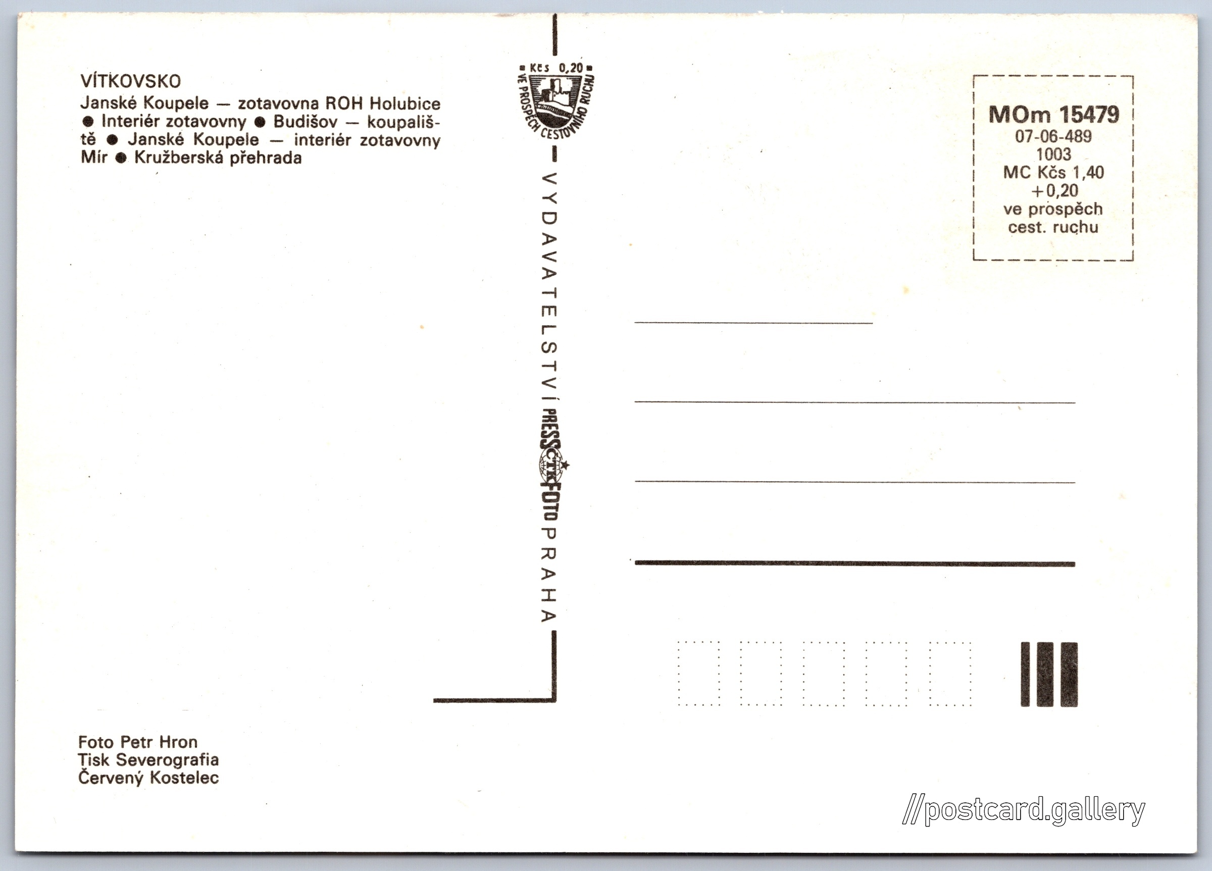 Cena pohlednice: 1,40 Kčs (CSK) (+0,20 Kčs přípl. na tur. ruch)