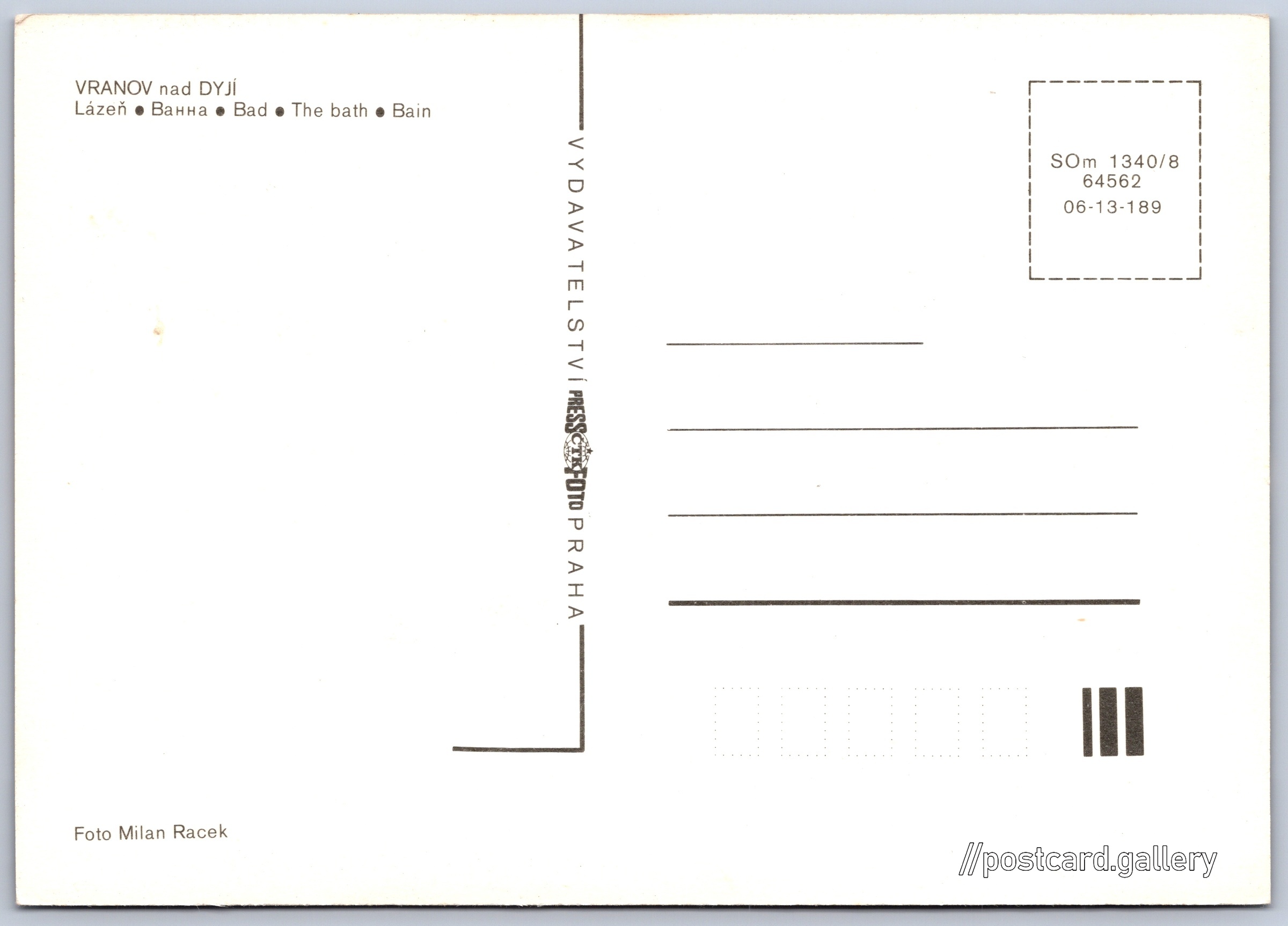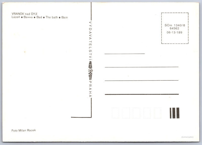Vranov, zámek, lázeň Pokud chcete vidět pohlednice ve vyšším rozlišení nebo zobrazovat jejich zadní stranu, tak se prosím nejdříve přihlašte Přihlásit Zaregistrovat VRANOV nad DYJÍ- Lázeň- Bанна- Bad- The bath- Bain Jazyk tištěného textu na pohlednici: čeština Zámecká 93, 671 03 Vranov nad Dyjí, Czechia ukázat na mapě V blízkém okolí místa zobrazeného na pohlednici lze najít 20 jiných pohlednic. Zobrazit blízké pohlednice Vydavatel: PressFoto Praha (Československo) Rok vydání pohlednice: 1981 Velikost (š x v) a tvar pohlednice: 147 x 104 mm (5.79" x 4.09"), obdélník Osoby spjaté s touto pohlednicí: Milan Racek(Autor fotografie) Čistá pohlednice (neprošlá poštou) Kódy na pohlednici: SOm 1340/8 64562 06-13-189 DiskuseVložit příspěvek Přidat novou složku ... Spravovat složky ...
