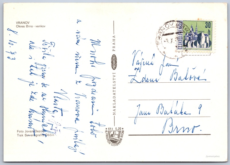 Vranov Pokud chcete vidět pohlednice ve vyšším rozlišení nebo zobrazovat jejich zadní stranu, tak se prosím nejdříve přihlašte Přihlásit Zaregistrovat VRANOVOkres Brno - venkov Jazyk tištěného textu na pohlednici: čeština Vranov, Brno-venkov ukázat na mapě Vydavatel: PressFoto Praha (Československo) Odhadované datum vydání pohlednice: 1970 - 1973 Pomozte nám zpřesnit rok vzniku pohlednice Velikost (š x v) a tvar pohlednice: 148 x 105 mm (5.83" x 4.13"), obdélník Osoby spjaté s touto pohlednicí: Jovan Dezort(Autor fotografie) Prošlá poštou:Datum na razítku: 8.10.1973Datum napsání pohledu: 8.10.1973 Ceny: Příplatek na tur. ruch: 0,20 Kčs (CSK))Vyplacené známky: 0,30 Kčs (CSK) DiskuseVložit příspěvek Přidat novou složku ... Spravovat složky ...