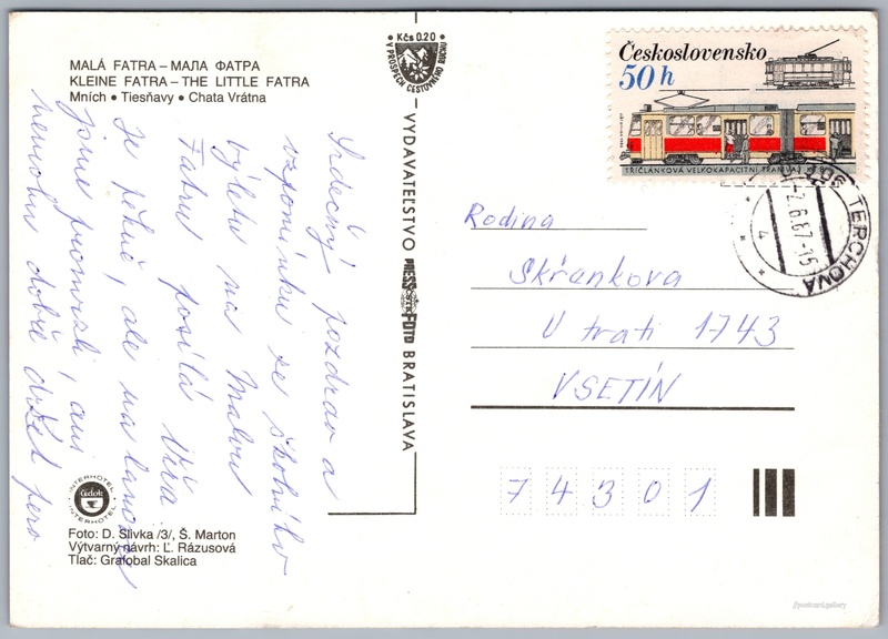 Vrátna dolina Pokud chcete vidět pohlednice ve vyšším rozlišení nebo zobrazovat jejich zadní stranu, tak se prosím nejdříve přihlašte Přihlásit Zaregistrovat Vrátna dolina MALÁ FATRA - MAЛA ATPAKLEINE FATRA - THE LITTLE FATRA- Mních- Tiesňavy- Chata Vrátna Jazyk tištěného textu na pohlednici: slovenština Tiesňavy, Chráněné území, Terchová, Slovensko ukázat na mapě V blízkém okolí místa zobrazeného na pohlednici lze najít 30 jiných pohlednic. Zobrazit blízké pohlednice Vydavatel: PressFoto Bratislava (Československo) Odhadované datum vydání pohlednice: 1984 - 1987 Pomozte nám zpřesnit rok vzniku pohlednice Velikost (š x v) a tvar pohlednice: 148 x 105 mm (5.83" x 4.13"), obdélník Osoby spjaté s touto pohlednicí: D. Slivka(Autor fotografie) Ľ. Rázusová(Design pohlednice) Š. Marton(Autor fotografie) Prošlá poštou:Datum na razítku: 2.6.1987 Ceny: Příplatek na tur. ruch: 0,20 Kčs (CSK))Vyplacené známky: 0,50 Kčs (CSK) DiskuseVložit příspěvek Přidat novou složku ... Spravovat složky ...
