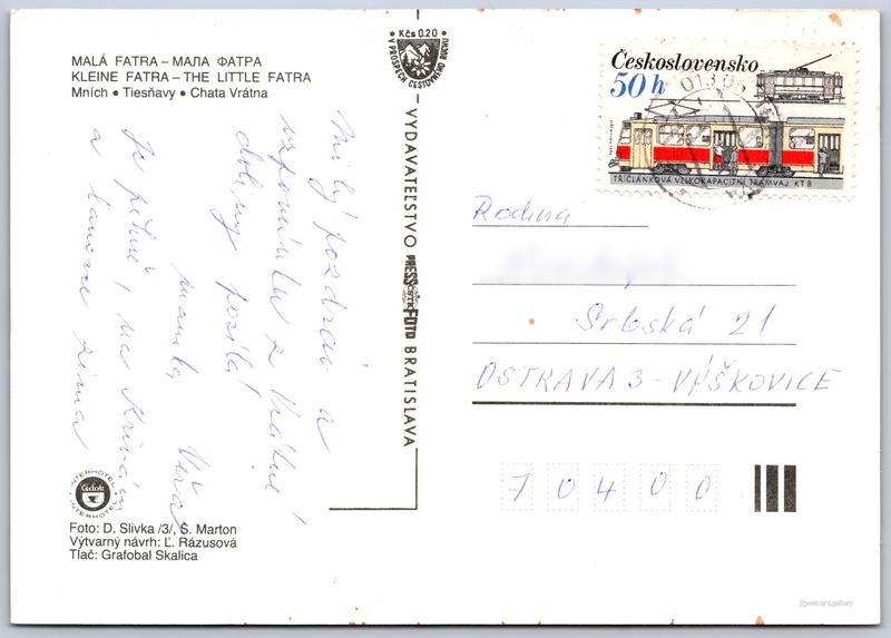 Vrátna dolina Pokud chcete vidět pohlednice ve vyšším rozlišení nebo zobrazovat jejich zadní stranu, tak se prosím nejdříve přihlašte Přihlásit Zaregistrovat Vrátna dolina MALÁ FATRA - MAЛA ФАТРАKLEINE FATRA - THE LITTLE FATRA- Mních- Tiesňavy- Chata Vrátna Jazyky tištěného textu na pohlednici: slovenština, ruština, němčina, angličtina Chata Vrátna, Chata, bouda, Turistická 508, Terchová, Slovensko ukázat na mapě Vydavatel: PressFoto Bratislava (Československo) Odhadované datum vydání pohlednice: 1984 - 1987 Pomozte nám zpřesnit rok vzniku pohlednice Velikost (š x v) a tvar pohlednice: 148 x 105 mm (5.83" x 4.13"), obdélník Osoby spjaté s touto pohlednicí: D. Slivka(Autor fotografie) Ľ. Rázusová(Design pohlednice) Š. Marton(Autor fotografie) Prošlá poštou Ceny: Příplatek na tur. ruch: 0,20 Kčs (CSK))Vyplacené známky: 0,50 Kčs (CSK) DiskuseVložit příspěvek Přidat novou složku ... Spravovat složky ...