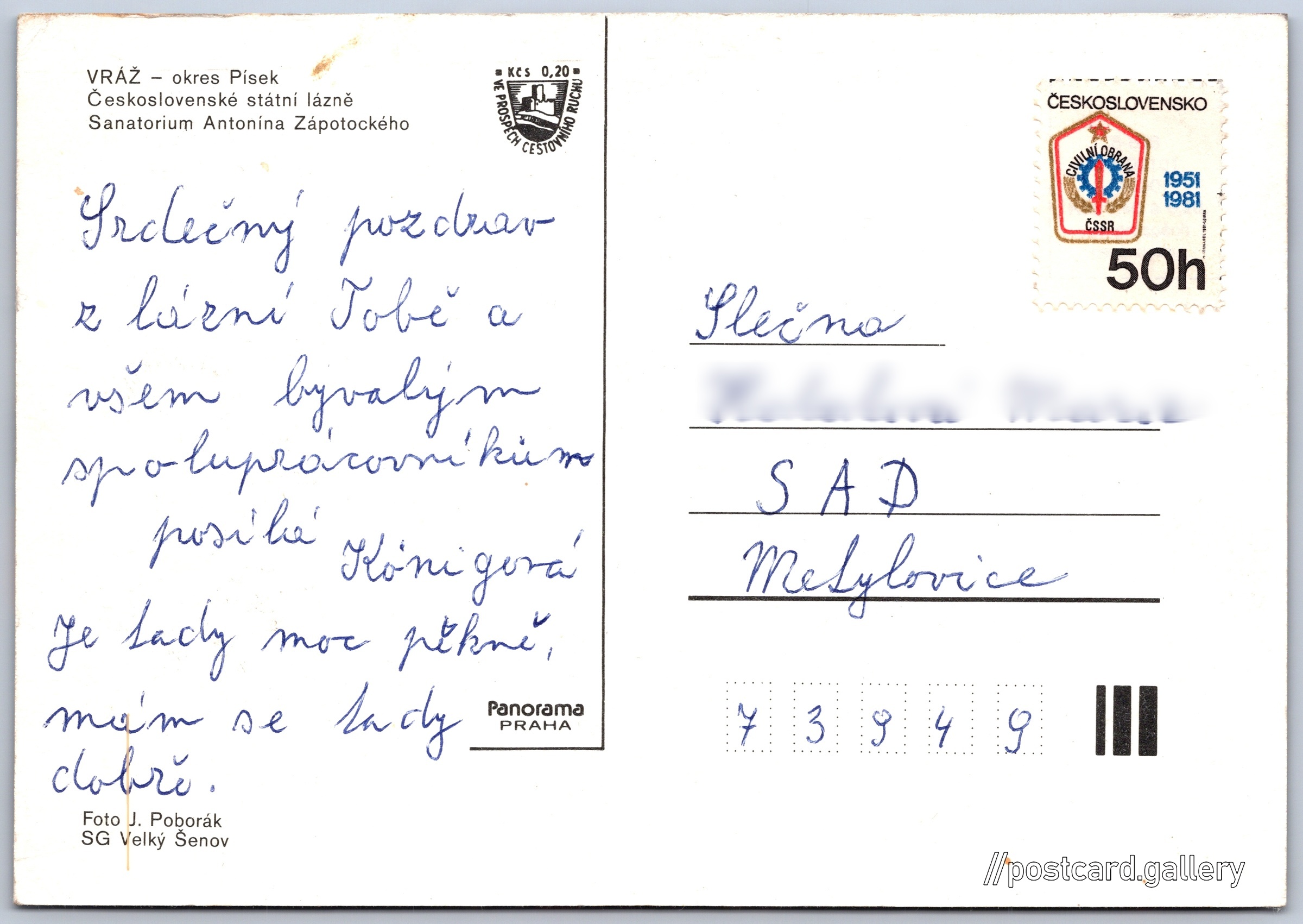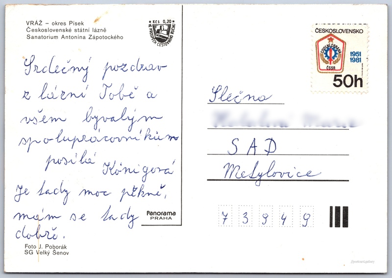 Vráž u Písku Pokud chcete vidět pohlednice ve vyšším rozlišení nebo zobrazovat jejich zadní stranu, tak se prosím nejdříve přihlašte Přihlásit Zaregistrovat Vráž u Písku VRÁŽ - okres PísekČeskoslovenské státní lázněSanatorium Antonína Zápotockého Jazyk tištěného textu na pohlednici: čeština Stará Vráž 1, Vráž, 398 32, Písek ukázat na mapě Vydavatel: Panorama (Československo) Odhadované datum vydání pohlednice: 1979 - 1982 Pomozte nám zpřesnit rok vzniku pohlednice Velikost (š x v) a tvar pohlednice: 147 x 103 mm (5.79" x 4.06"), obdélník Osoby spjaté s touto pohlednicí: J. Poborák(Autor fotografie) Prošlá poštou Ceny: Příplatek na tur. ruch: 0,20 Kčs (CSK))Vyplacené známky: 0,50 Kčs (CSK) DiskuseVložit příspěvek Přidat novou složku ... Spravovat složky ...