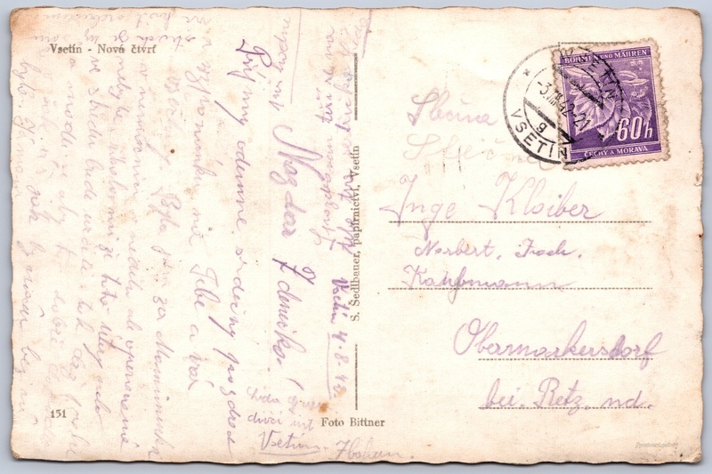 Vsetín, nová čtvrť Pokud chcete vidět pohlednice ve vyšším rozlišení nebo zobrazovat jejich zadní stranu, tak se prosím nejdříve přihlašte Přihlásit Zaregistrovat Vsetín - Nová čtvrť Jazyk tištěného textu na pohlednici: angličtina Sušilova 1330, Vsetín, 755 01, Vsetín ukázat na mapě V blízkém okolí místa zobrazeného na pohlednici lze najít 4 jiné pohlednice. Zobrazit blízké pohlednice Odhadované datum vydání pohlednice: 1939 - 1942 Pomozte nám zpřesnit rok vzniku pohlednice Velikost (š x v) a tvar pohlednice: 140 x 93 mm (5.51" x 3.66"), obdélník, zoubkovaný Prošlá poštou:Datum na razítku: 3.8.1942Datum napsání pohledu: 4.8.1942 Ceny: Vyplacené známky: 0,60 Kčs (CSK) Kódy na pohlednici: 151 DiskuseVložit příspěvek Přidat novou složku ... Spravovat složky ...