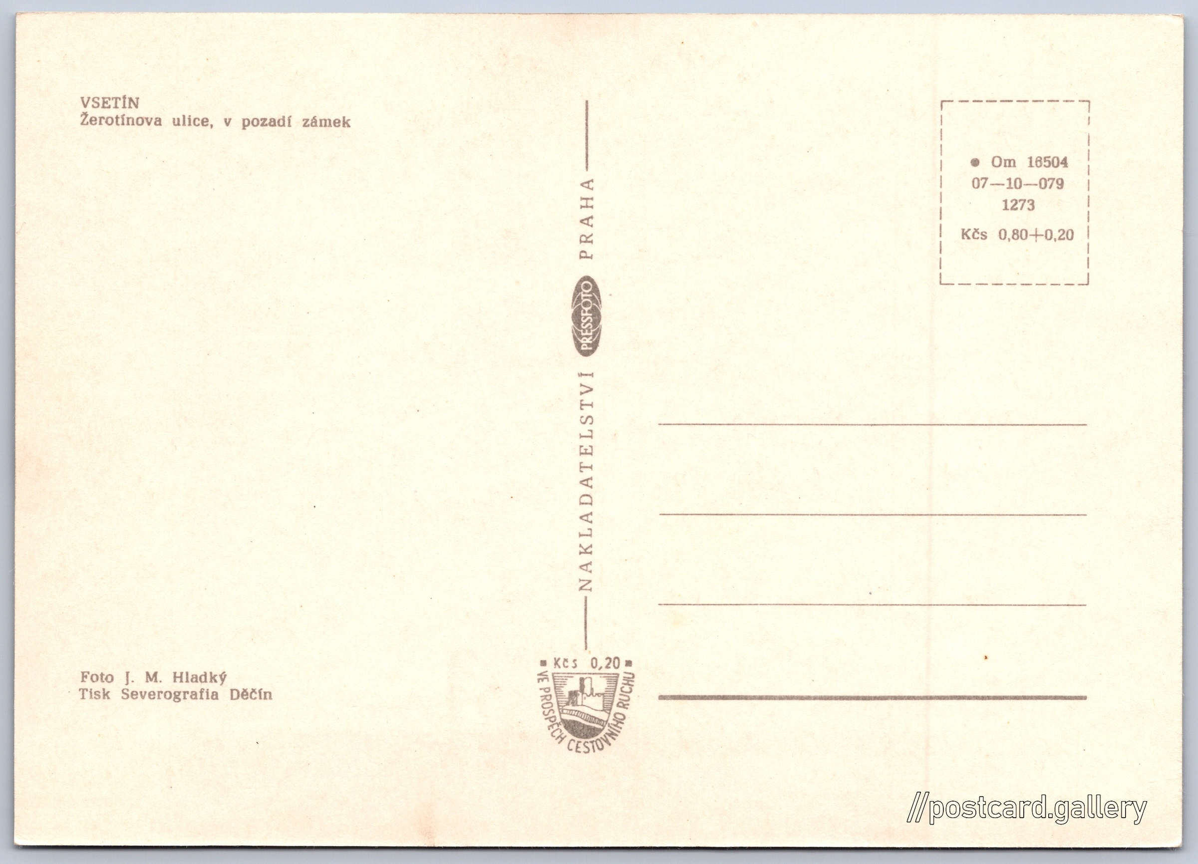 Vsetín, Žerotínova ulice 3/4 Pokud chcete vidět pohlednice ve vyšším rozlišení nebo zobrazovat jejich zadní stranu, tak se prosím nejdříve přihlašte Přihlásit Zaregistrovat VSETÍNŽerotínova ulice, v pozadí zámek Jazyk tištěného textu na pohlednici: čeština Žerotínova, Vsetín, Vsetín ukázat na mapě Vydavatel: PressFoto Praha (Československo) Rok vydání pohlednice: 1970 Velikost (š x v) a tvar pohlednice: 147 x 104 mm (5.79" x 4.09"), obdélník Osoby spjaté s touto pohlednicí: Jar. M. Hladký(Autor fotografie) Čistá pohlednice (neprošlá poštou) Ceny: Cena pohlednice: 0,80 Kčs (CSK) (+0,20 Kčs přípl. na tur. ruch) Kódy na pohlednici: •Om 16504 07-10-079 1273 DiskuseVložit příspěvek Přidat novou složku ... Spravovat složky ...