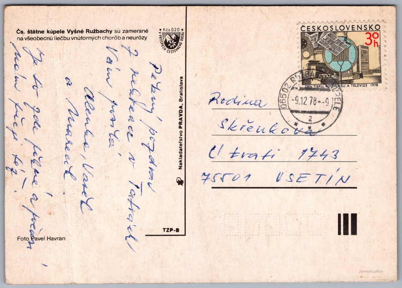 Vyšné Ružbachy 1/2 Pokud chcete vidět pohlednice ve vyšším rozlišení nebo zobrazovat jejich zadní stranu, tak se prosím nejdříve přihlašte Přihlásit Zaregistrovat Vyšné Ružbachy Čs. štátne kúpele Vyšné Ružbachy sú zamerané na všeobecnú liečbu vnútorných chorôb a neurózy Jazyk tištěného textu na pohlednici: slovenština Vyšné Ružbachy, kúpele, Turistický rozcestník, Vyšné Ružbachy, Slovensko ukázat na mapě V blízkém okolí místa zobrazeného na pohlednici lze najít 6 jiných pohlednic. Zobrazit blízké pohlednice Vydavatel: Nakladateľstvo PRAVDA, Bratislava (Československo) Odhadované datum vydání pohlednice: 1975 - 1978 Pomozte nám zpřesnit rok vzniku pohlednice Velikost (š x v) a tvar pohlednice: 148 x 105 mm (5.83" x 4.13"), obdélník Osoby spjaté s touto pohlednicí: Pavel Havran(Autor fotografie) Prošlá poštou:Datum na razítku: 9.12.1978 Ceny: Příplatek na tur. ruch: 0,20 Kčs (CSK))Vyplacené známky: 0,30 Kčs (CSK) DiskuseVložit příspěvek Přidat novou složku ... Spravovat složky ...