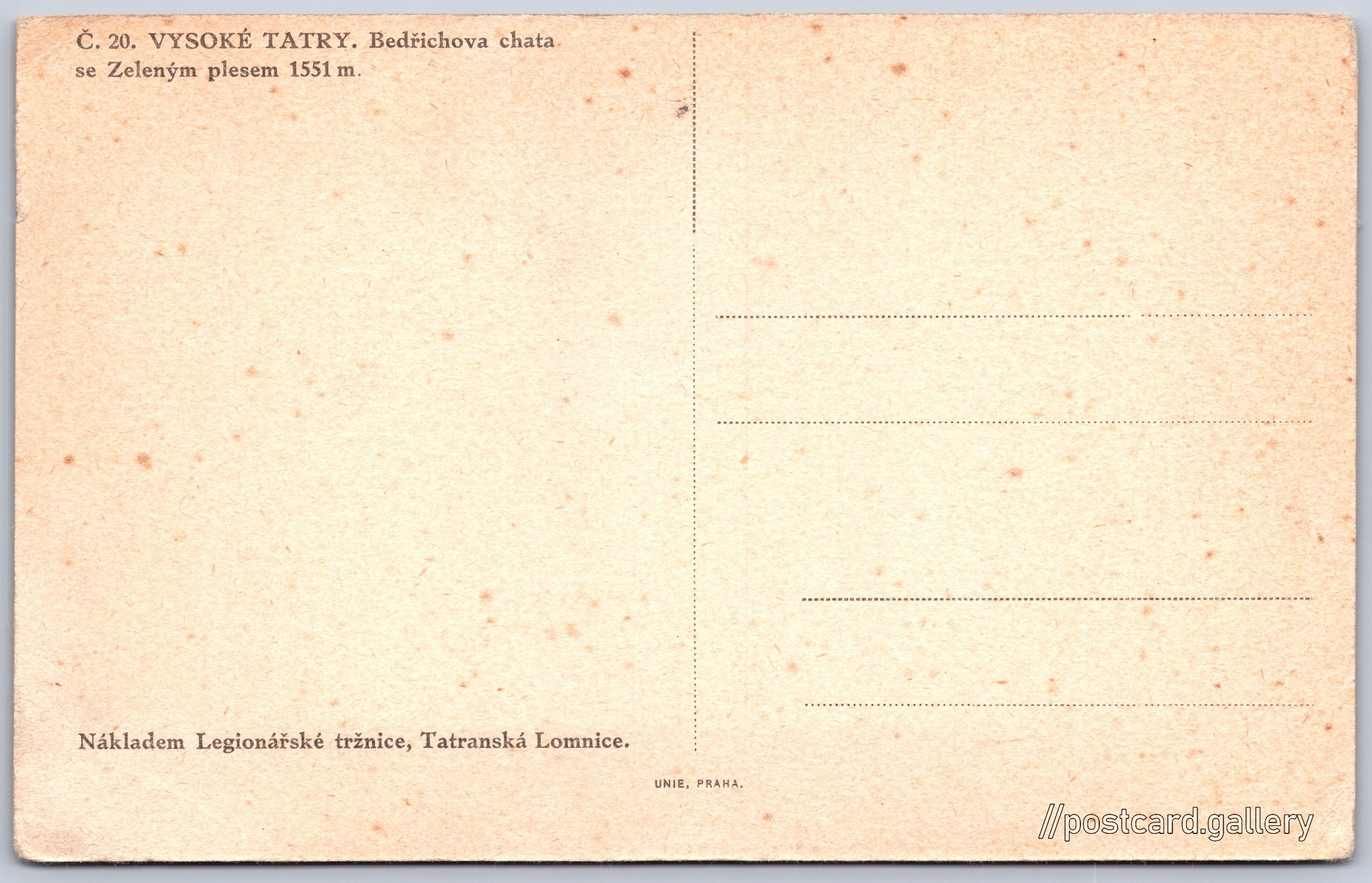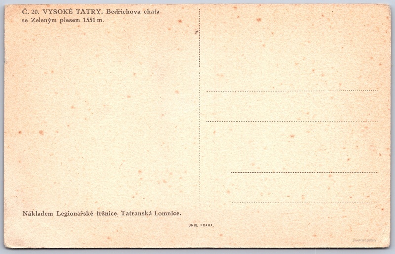 Vysoké Tatry, Bedřichova chata se Zeleným plesem Pokud chcete vidět pohlednice ve vyšším rozlišení nebo zobrazovat jejich zadní stranu, tak se prosím nejdříve přihlašte Přihlásit Zaregistrovat Č. 20. VYSOKÉ TATRY. Bedřichova chata se Zeleným plesem 1551 m. Jazyk tištěného textu na pohlednici: slovenština Chata u Zeleného plesa, Chata, bouda, Tatranská Lomnica 445, Vysoké Tatry - Tatranská Lomnica, Slovensko ukázat na mapě V blízkém okolí místa zobrazeného na pohlednici lze najít 112 jiných pohlednic. Zobrazit blízké pohlednice Vydavatel: Legionářská tržnice (Československo)UNIE Praha (Československo) Datum vydání není známo Pomozte nám odhadnout datum vzniku pohlednice Velikost (š x v) a tvar pohlednice: 141 x 90 mm (5.55" x 3.54"), obdélník Čistá pohlednice (neprošlá poštou) Kódy na pohlednici: 20 DiskuseVložit příspěvek Přidat novou složku ... Spravovat složky ...