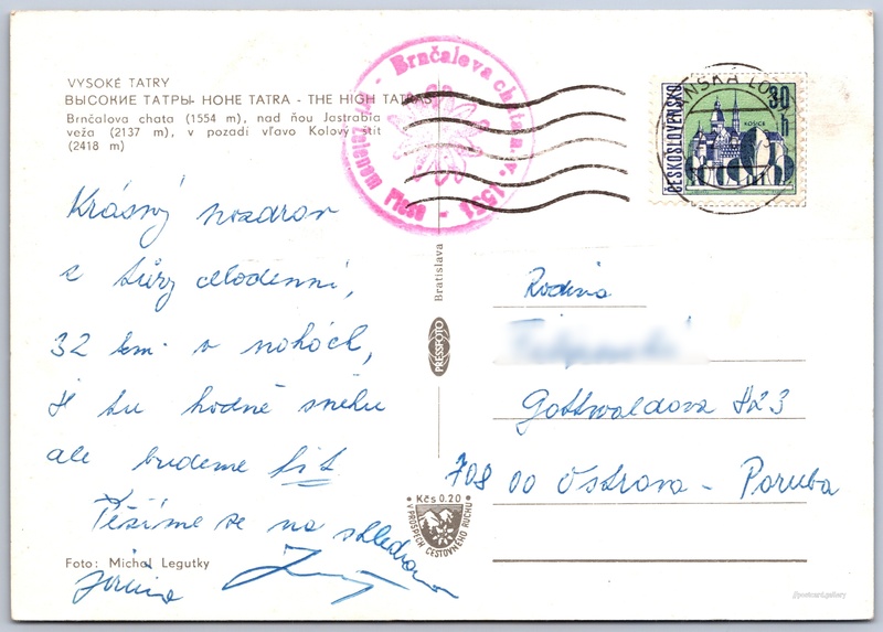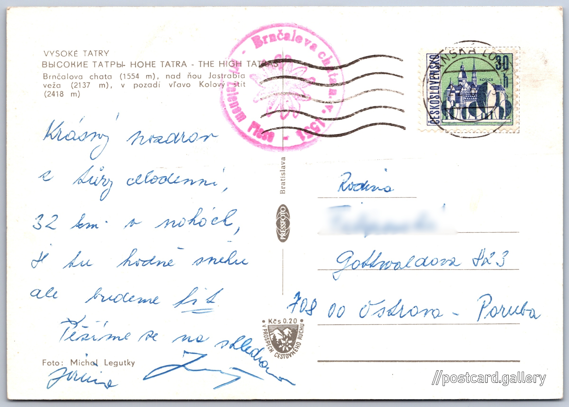 Vysoké Tatry, Brnčalova chata Pokud chcete vidět pohlednice ve vyšším rozlišení nebo zobrazovat jejich zadní stranu, tak se prosím nejdříve přihlašte Přihlásit Zaregistrovat VYSOKÉ TATRYВЫСОКИЕ ТАТРЫ - НОНЕ TATRA - THE HIGH ТАТRASBrnčalova chata (1554 m), nad ňou Jastrabia veža (2137 m), v pozadí vľavo Kolový štít (2418 m) Jazyky tištěného textu na pohlednici: slovenština, ruština, němčina, angličtina Chata u Zeleného plesa, Chata, bouda, Tatranská Lomnica 445, Vysoké Tatry - Tatranská Lomnica, Slovensko ukázat na mapě Vydavatel: PressFoto Bratislava (Československo) Odhadované datum vydání pohlednice: 1970 - 1973 Pomozte nám zpřesnit rok vzniku pohlednice Velikost (š x v) a tvar pohlednice: 149 x 105 mm (5.87" x 4.13"), obdélník Osoby spjaté s touto pohlednicí: Michal Legutky(Autor fotografie) Prošlá poštou:Datum na razítku: 22.6.1973 Ceny: Příplatek na tur. ruch: 0,20 Kčs (CSK))Vyplacené známky: 0,30 Kčs (CSK) DiskuseVložit příspěvek Přidat novou složku ... Spravovat složky ...