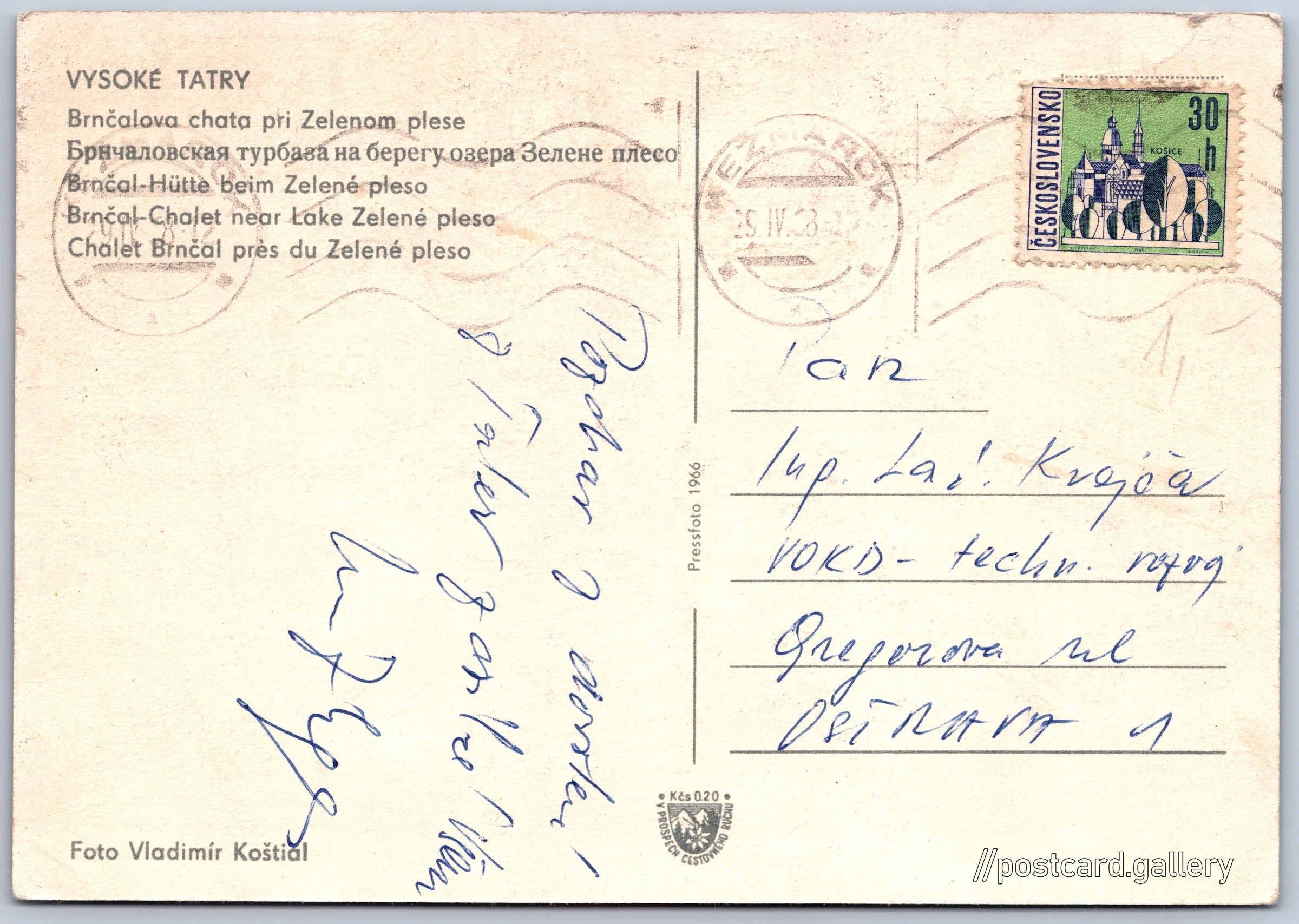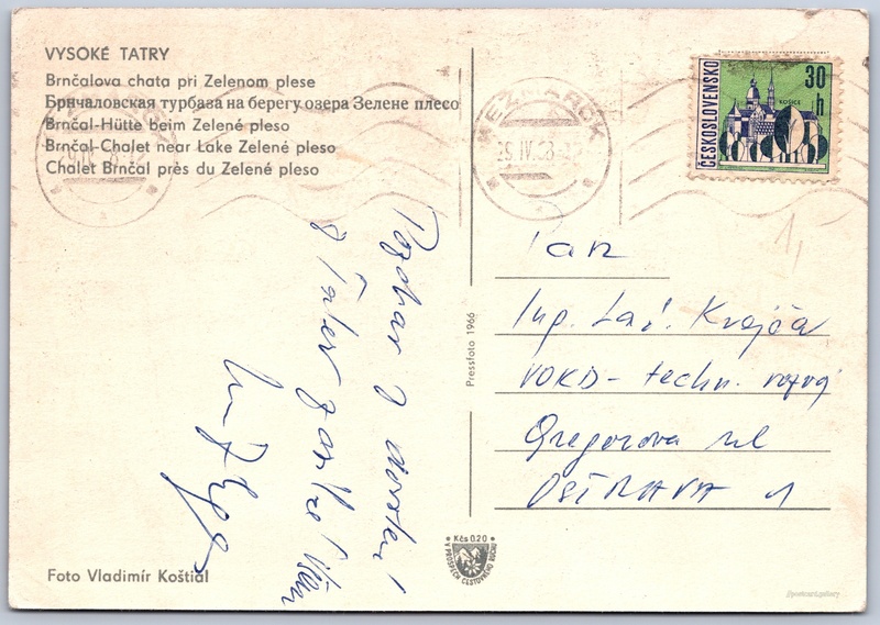 Vysoké Tatry, Brnčalova chata 6/131 Pokud chcete vidět pohlednice ve vyšším rozlišení nebo zobrazovat jejich zadní stranu, tak se prosím nejdříve přihlašte Přihlásit Zaregistrovat VYSOKÉ TATRY- Brnčalova chata pri Zelenom plese- Брнчаловская турбаза на берегу озера Зелене плесо- Brnčal-Hütte beim Zelené pleso- Brnčal-Chalet near Lake Zelené pleso- Chalet Brnčal près du Zelené pleso Jazyk tištěného textu na pohlednici: slovenština Chata pri Zelenom plese, Chata, bouda, Tatranská Lomnica 445, Vysoké Tatry - Tatranská Lomnica, Slovensko ukázat na mapě V blízkém okolí místa zobrazeného na pohlednici lze najít 112 jiných pohlednic. Zobrazit blízké pohlednice Vydavatel: PressFoto Praha (Československo) Odhadované datum vydání pohlednice: 1965 - 1968 Pomozte nám zpřesnit rok vzniku pohlednice Velikost (š x v) a tvar pohlednice: 149 x 104 mm (5.87" x 4.09"), obdélník Osoby spjaté s touto pohlednicí: Vladimír Koštial(Autor fotografie) Prošlá poštou:Datum na razítku: 29.4.1968 Ceny: Příplatek na tur. ruch: 0,20 Kčs (CSK))Vyplacené známky: 0,30 Kčs (CSK) DiskuseVložit příspěvek Přidat novou složku ... Spravovat složky ...