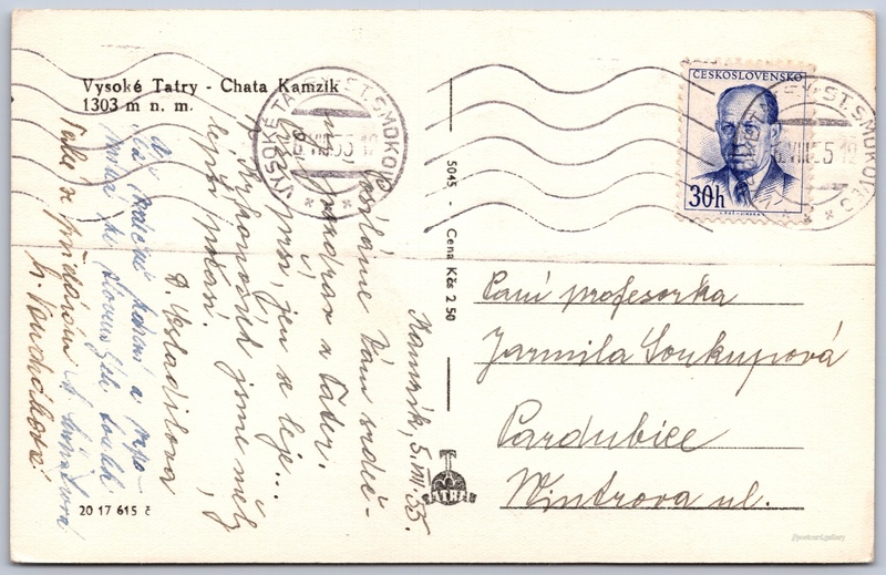 Vysoké Tatry, chata Kamzík Pokud chcete vidět pohlednice ve vyšším rozlišení nebo zobrazovat jejich zadní stranu, tak se prosím nejdříve přihlašte Přihlásit Zaregistrovat Vysoké Tatry - Chata Kamzik1303 m n. m. Jazyk tištěného textu na pohlednici: slovenština Tatranská Lomnica ukázat na mapě V blízkém okolí místa zobrazeného na pohlednici lze najít 159 jiných pohlednic. Zobrazit blízké pohlednice Vydavatel: Tatran (Československo) Odhadované datum vydání pohlednice: 1950 - 1953 Pomozte nám zpřesnit rok vzniku pohlednice Velikost (š x v) a tvar pohlednice: 139 x 89 mm (5.47" x 3.50"), obdélník Prošlá poštou:Datum na razítku: 6.8.1955Datum napsání pohledu: 5.8.1955 Ceny: Cena pohlednice: 2,50 Kčs (CSK)Vyplacené známky: 0,30 Kčs (CSK) Kódy na pohlednici: 20 17 615 c 5045 DiskuseVložit příspěvek Přidat novou složku ... Spravovat složky ...
