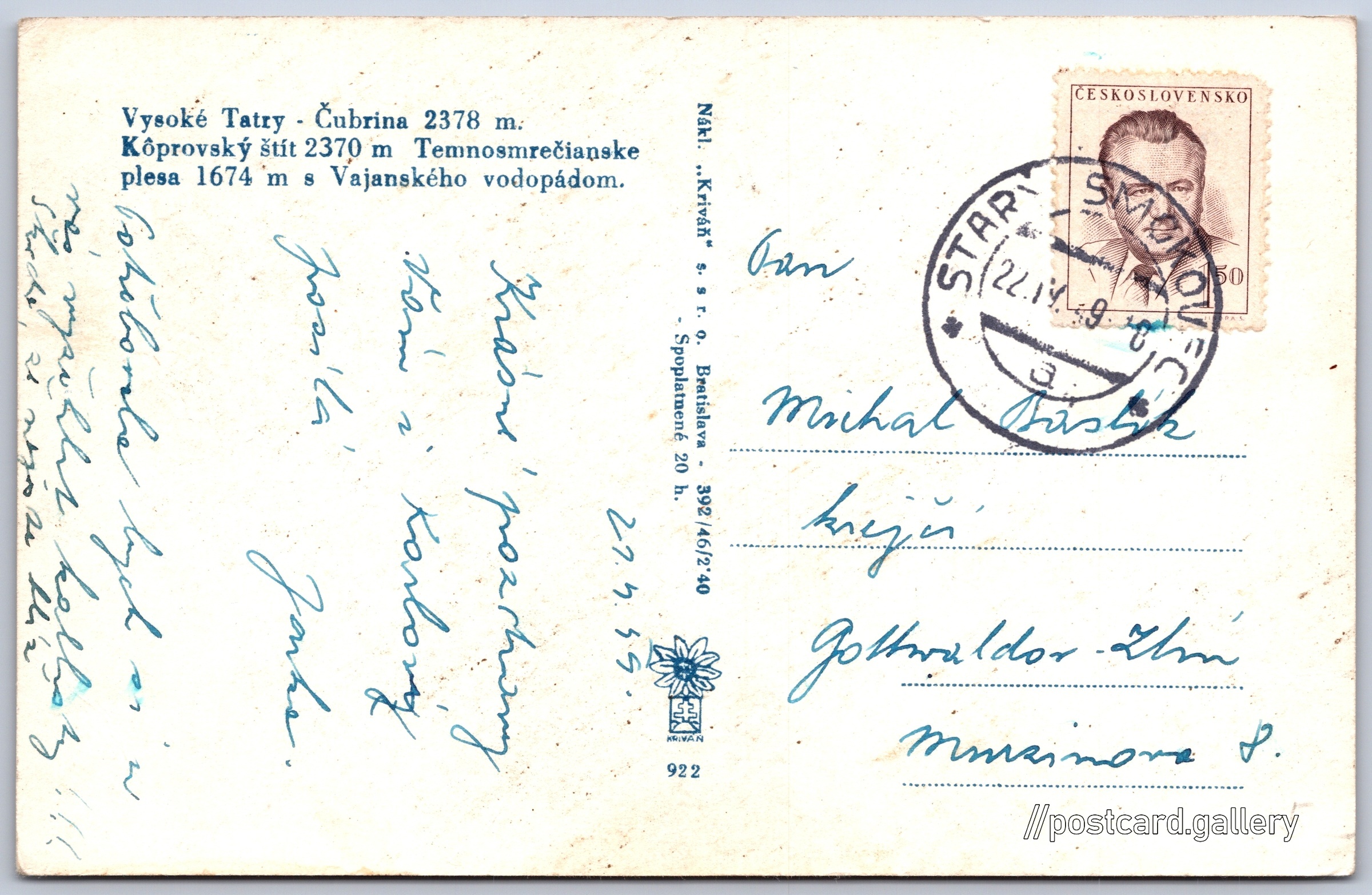 Vysoké Tatry, Čubrina Pokud chcete vidět pohlednice ve vyšším rozlišení nebo zobrazovat jejich zadní stranu, tak se prosím nejdříve přihlašte Přihlásit Zaregistrovat Vysoké Tatry - Čubrina 2378 m.Kôprovský štít 2370 m, Temnosmrečianske plesa 1674 m s Vajanského vodopádom. Jazyk tištěného textu na pohlednici: slovenština Čubrina (2376 m), Hora, výškový bod, Vysoké Tatry - Štrbské Pleso, Slovensko ukázat na mapě V blízkém okolí místa zobrazeného na pohlednici lze najít 70 jiných pohlednic. Zobrazit blízké pohlednice Vydavatel: Kriváň (Československo) Rok vydání pohlednice: 1946 Velikost (š x v) a tvar pohlednice: 139 x 90 mm (5.47" x 3.54"), obdélník Prošlá poštou:Datum na razítku: 22.4.1949Datum napsání pohledu: 21.4.1949 Ceny: Cena pohlednice: 2,40 Kčs (CSK) (+0,20 Kčs přípl. na tur. ruch)Vyplacené známky: 1,50 Kčs (CSK) Kódy na pohlednici: 392/46 922 DiskuseVložit příspěvek Přidat novou složku ... Spravovat složky ...