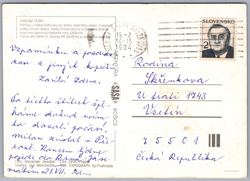 Vysoké Tatry, dolina Zeleného Plesa Pokud chcete vidět pohlednice ve vyšším rozlišení nebo zobrazovat jejich zadní stranu, tak se prosím nejdříve přihlašte Přihlásit Zaregistrovat Vysoké Tatry VYSOKÉ TATRYPohľad z Veľkej Svišťovky do doliny Zeleného plesa. V pozadí Veľká Zmrzlá dolina, Malá Zmrzlá dolina a Červená dolina. Nad nimi dominujú Baranie rohy (2526 m), Čierny štít (2434 m), Kolový štít (2418 m) a Jastrabia veža. Jazyk tištěného textu na pohlednici: slovenština Dolina Zeleného plesa, Kaňon, rokle, soutěska, údolí, Tatranská Lomnica 445, Vysoké Tatry - Tatranská Lomnica, Slovensko ukázat na mapě V blízkém okolí místa zobrazeného na pohlednici lze najít 131 jiných pohlednic. Zobrazit blízké pohlednice Vydavatel: Agentúra Sáša Košice (Slovensko) Odhadované datum vydání pohlednice: 1991 - 1994 Pomozte nám zpřesnit rok vzniku pohlednice Velikost (š x v) a tvar pohlednice: 148 x 106 mm (5.83" x 4.17"), obdélník Osoby spjaté s touto pohlednicí: Alexander Jiroušek(Autor fotografie) Igor Melicherčík(Design pohlednice) Prošlá poštou:Datum na razítku: 15.7.1994 Ceny: Vyplacené známky: 2,00 Sk (SKK) DiskuseVložit příspěvek Přidat novou složku ... Spravovat složky ...
