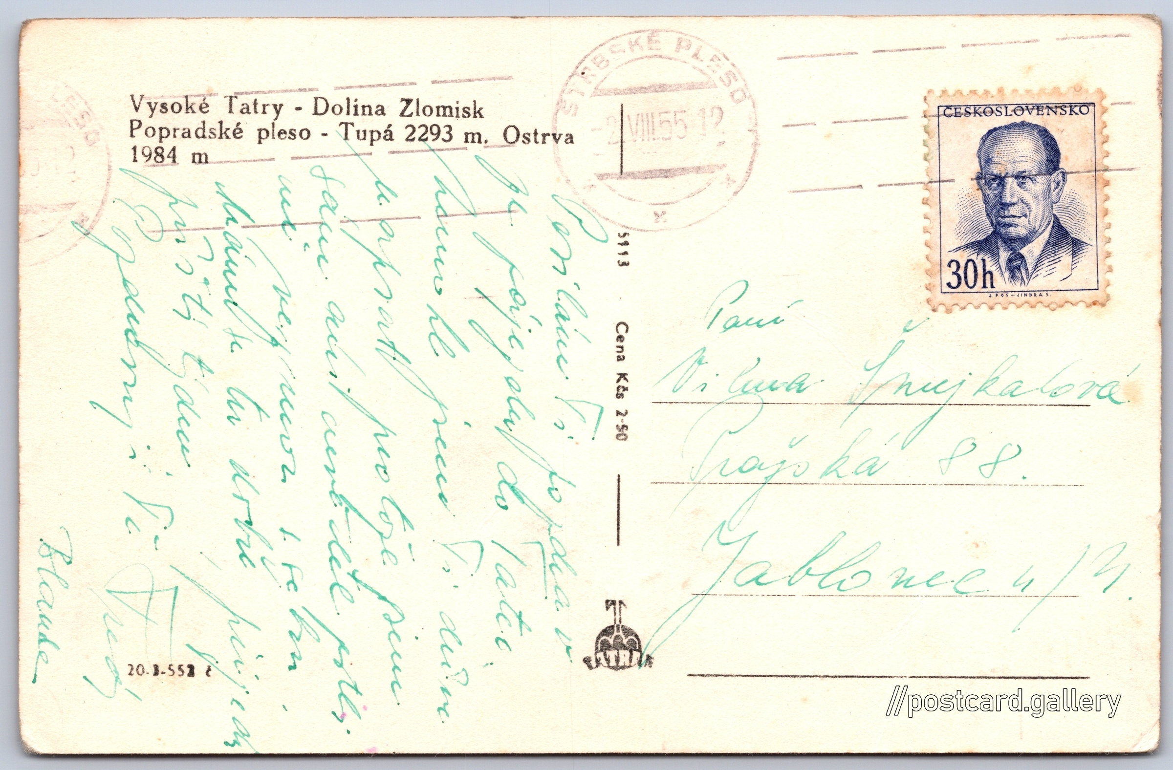 Vysoké Tatry, dolina Zlomisk Pokud chcete vidět pohlednice ve vyšším rozlišení nebo zobrazovat jejich zadní stranu, tak se prosím nejdříve přihlašte Přihlásit Zaregistrovat Vysoké Tatry - Dolina ZlomiskPopradské pleso - Tupá 2293 m. Ostrva 1984 m Jazyk tištěného textu na pohlednici: slovenština Zlomisková dolina, Kaňon, rokle, soutěska, údolí, Vysoké Tatry - Štrbské Pleso, Slovensko ukázat na mapě V blízkém okolí místa zobrazeného na pohlednici lze najít 117 jiných pohlednic. Zobrazit blízké pohlednice Vydavatel: Tatran (Československo) Odhadované datum vydání pohlednice: 1949 - 1953 Pomozte nám zpřesnit rok vzniku pohlednice Velikost (š x v) a tvar pohlednice: 139 x 90 mm (5.47" x 3.54"), obdélník Prošlá poštou:Datum na razítku: 2.8.1955 Ceny: Cena pohlednice: 2,50 Kčs (CSK)Vyplacené známky: 0,30 Kčs (CSK) Kódy na pohlednici: 5113 20-3-552 c. DiskuseVložit příspěvek Přidat novou složku ... Spravovat složky ...