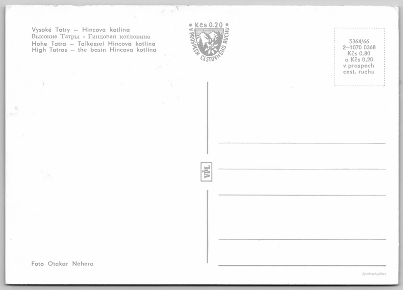 Vysoké Tatry, Hincova kotlina Pokud chcete vidět pohlednice ve vyšším rozlišení nebo zobrazovat jejich zadní stranu, tak se prosím nejdříve přihlašte Přihlásit Zaregistrovat Vysoké Tatry - Hincova kotlinaВысокие Татры - Гинцовая котловинаHohe Tatra - Talkessel Hincova kotlinaHigh Tatras - the basin Hincova kotlina Jazyk tištěného textu na pohlednici: slovenština Hincova kotlina, Kaňon, rokle, soutěska, údolí, Vysoké Tatry - Štrbské Pleso, Slovensko ukázat na mapě V blízkém okolí místa zobrazeného na pohlednici lze najít 79 jiných pohlednic. Zobrazit blízké pohlednice Vydavatel: VPL (Československo) Rok vydání pohlednice: březen, 1968 Velikost (š x v) a tvar pohlednice: 148 x 105 mm (5.83" x 4.13"), obdélník Osoby spjaté s touto pohlednicí: Otakar Nehera(Autor fotografie) Čistá pohlednice (neprošlá poštou) Ceny: Cena pohlednice: 0,80 Kčs (CSK) (+0,20 Kčs přípl. na tur. ruch) Kódy na pohlednici: 5364/66 2-1070 0368 DiskuseVložit příspěvek Přidat novou složku ... Spravovat složky ...