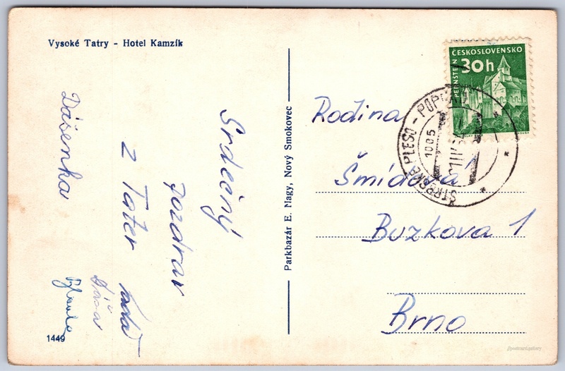 Vysoké Tatry, Hotel Kamzík Pokud chcete vidět pohlednice ve vyšším rozlišení nebo zobrazovat jejich zadní stranu, tak se prosím nejdříve přihlašte Přihlásit Zaregistrovat Vysoké Tatry - Hotel Kamzík Jazyk tištěného textu na pohlednici: slovenština Tatranská Lomnica ukázat na mapě V blízkém okolí místa zobrazeného na pohlednici lze najít 159 jiných pohlednic. Zobrazit blízké pohlednice Vydavatel: Parkbazár E. Nagy (Československo) Datum vydání není známo Pomozte nám odhadnout datum vzniku pohlednice Velikost (š x v) a tvar pohlednice: 139 x 90 mm (5.47" x 3.54"), obdélník Prošlá poštou Ceny: Vyplacené známky: 0,30 Kčs (CSK) Kódy na pohlednici: 1449 DiskuseVložit příspěvek Přidat novou složku ... Spravovat složky ...