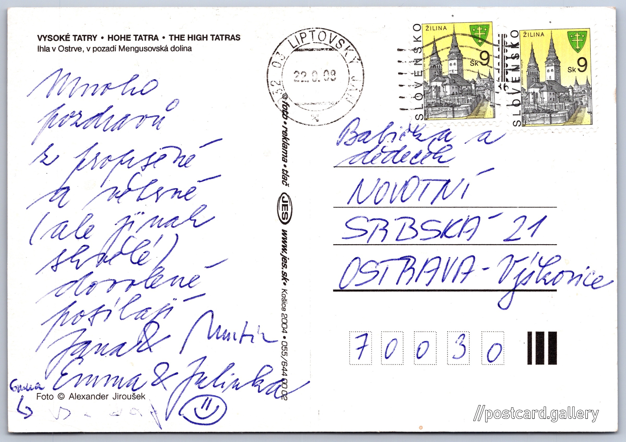 Vysoké Tatry, Ihla v Ostrve Pokud chcete vidět pohlednice ve vyšším rozlišení nebo zobrazovat jejich zadní stranu, tak se prosím nejdříve přihlašte Přihlásit Zaregistrovat Vysoké Tatry VYSOKÉ TATRY - HOHE TATRA - THE HIGH TATRASIhla v Ostrve, v pozadí Mengusovská dolina Jazyk tištěného textu na pohlednici: slovenština Ihla v Ostrve (1890 m), Hora, výškový bod, Vysoké Tatry - Štrbské Pleso, Slovensko ukázat na mapě V blízkém okolí místa zobrazeného na pohlednici lze najít 110 jiných pohlednic. Zobrazit blízké pohlednice Vydavatel: JES, Košice (Slovensko) Odhadované datum vydání pohlednice: 2005 - 2008 Pomozte nám zpřesnit rok vzniku pohlednice Velikost (š x v) a tvar pohlednice: 148 x 102 mm (5.83" x 4.02"), obdélník Osoby spjaté s touto pohlednicí: Alexander Jiroušek(Autor fotografie) Prošlá poštou:Datum na razítku: 22.9.2008 Ceny: Vyplacené známky: 18,00 Sk (SKK) DiskuseVložit příspěvek Přidat novou složku ... Spravovat složky ...
