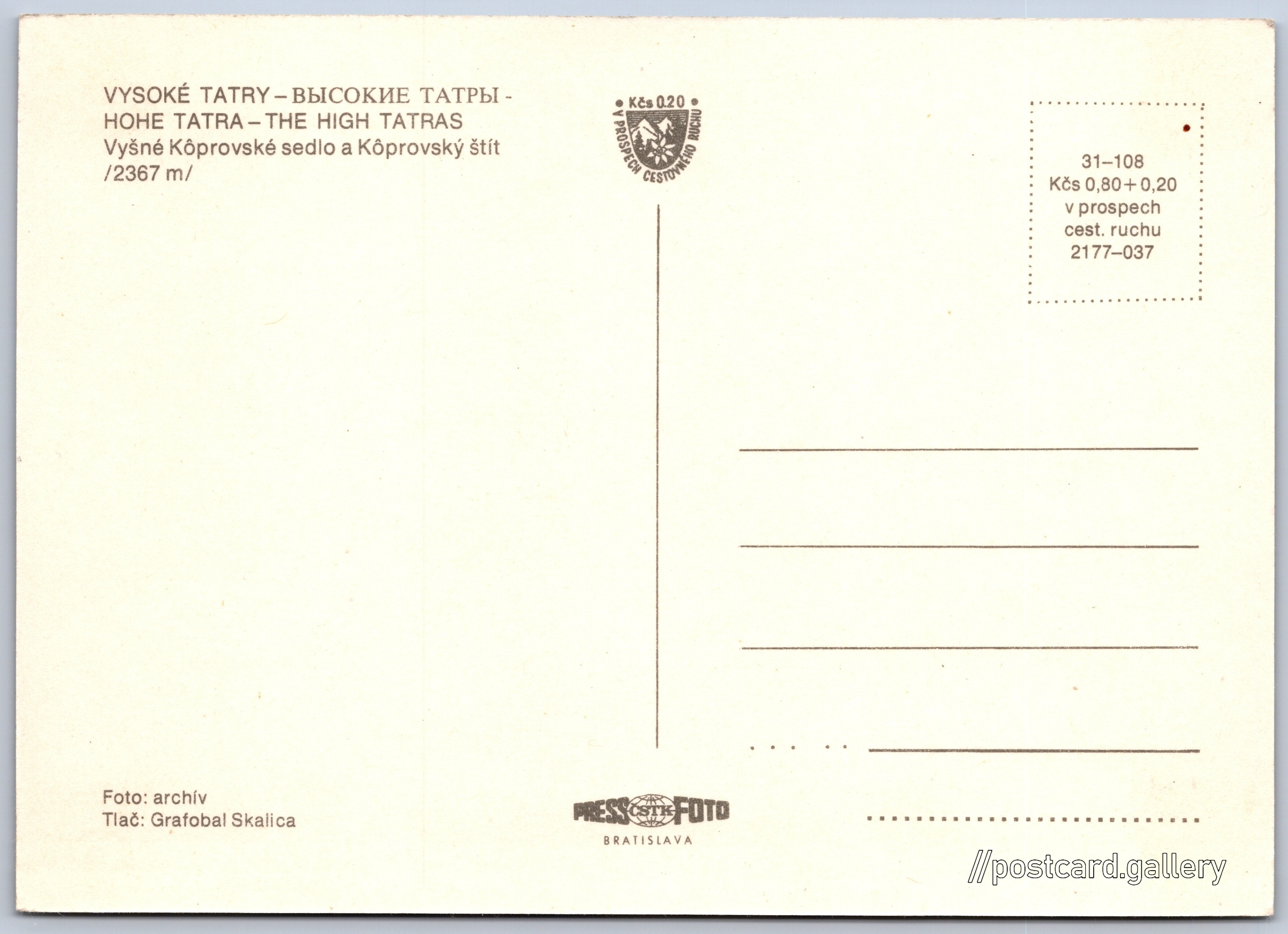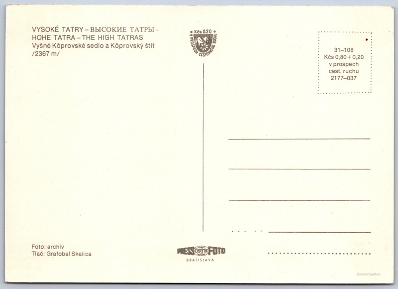 Vysoké Tatry, Koprovský štít Pokud chcete vidět pohlednice ve vyšším rozlišení nebo zobrazovat jejich zadní stranu, tak se prosím nejdříve přihlašte Přihlásit Zaregistrovat Vysoké Tatry VYSOKÉ TATRY-ВЫСОКИЕ ТАТРЫ - HOHE TATRA-THE HIGH TATRASVyšné Kôprovské sedlo a Kôprovský štít /2367 m/ Jazyk tištěného textu na pohlednici: slovenština Kôprovský štít (2363 m), Hora, výškový bod, Vysoké Tatry - Štrbské Pleso, Slovensko ukázat na mapě V blízkém okolí místa zobrazeného na pohlednici lze najít 74 jiných pohlednic. Zobrazit blízké pohlednice Vydavatel: PressFoto Bratislava (Československo) Rok vydání pohlednice: 1977 Velikost (š x v) a tvar pohlednice: 147 x 104 mm (5.79" x 4.09"), obdélník Čistá pohlednice (neprošlá poštou) Ceny: Cena pohlednice: 0,80 Kčs (CSK) (+0,20 Kčs přípl. na tur. ruch) Kódy na pohlednici: 31-108 2177-037 DiskuseVložit příspěvek Přidat novou složku ... Spravovat složky ...